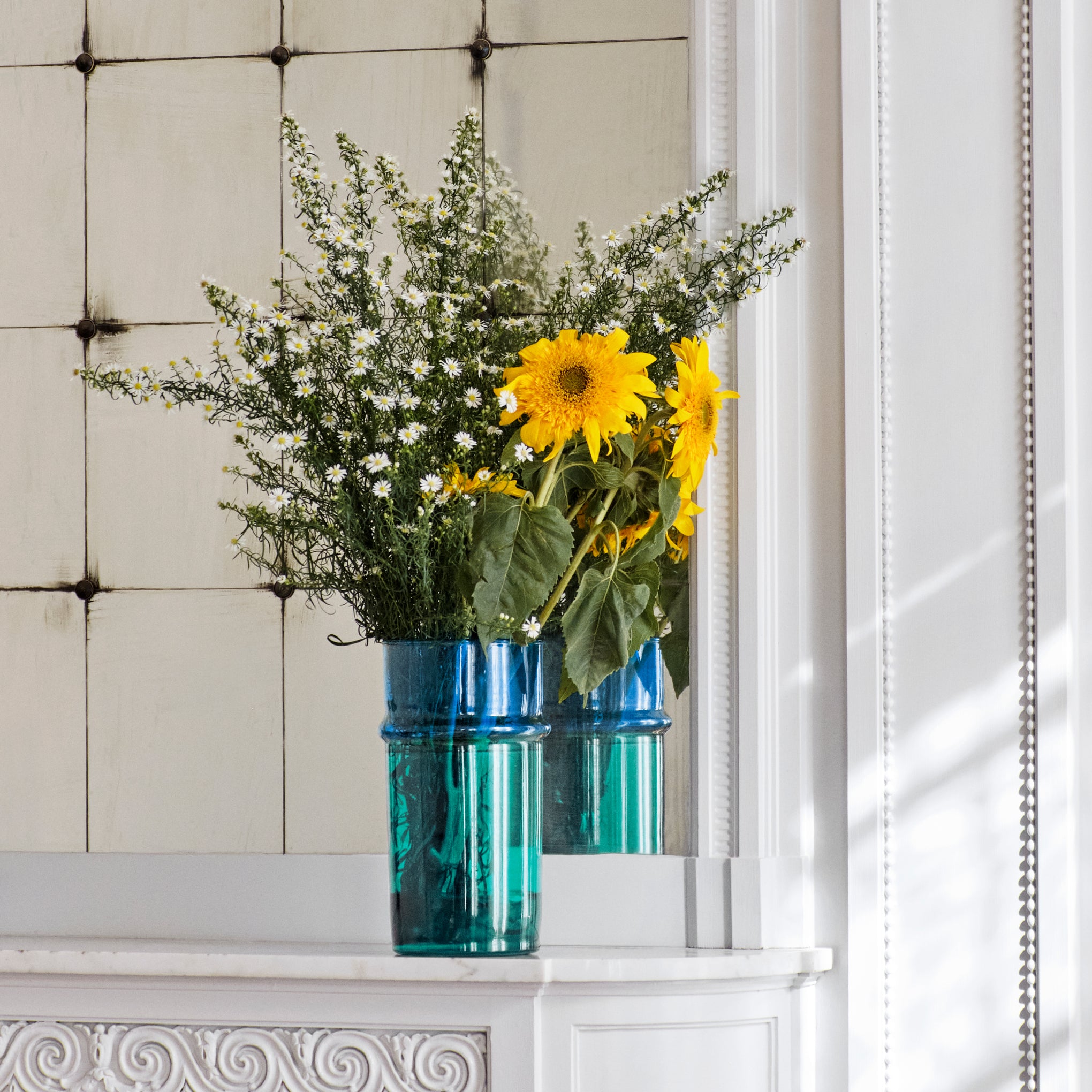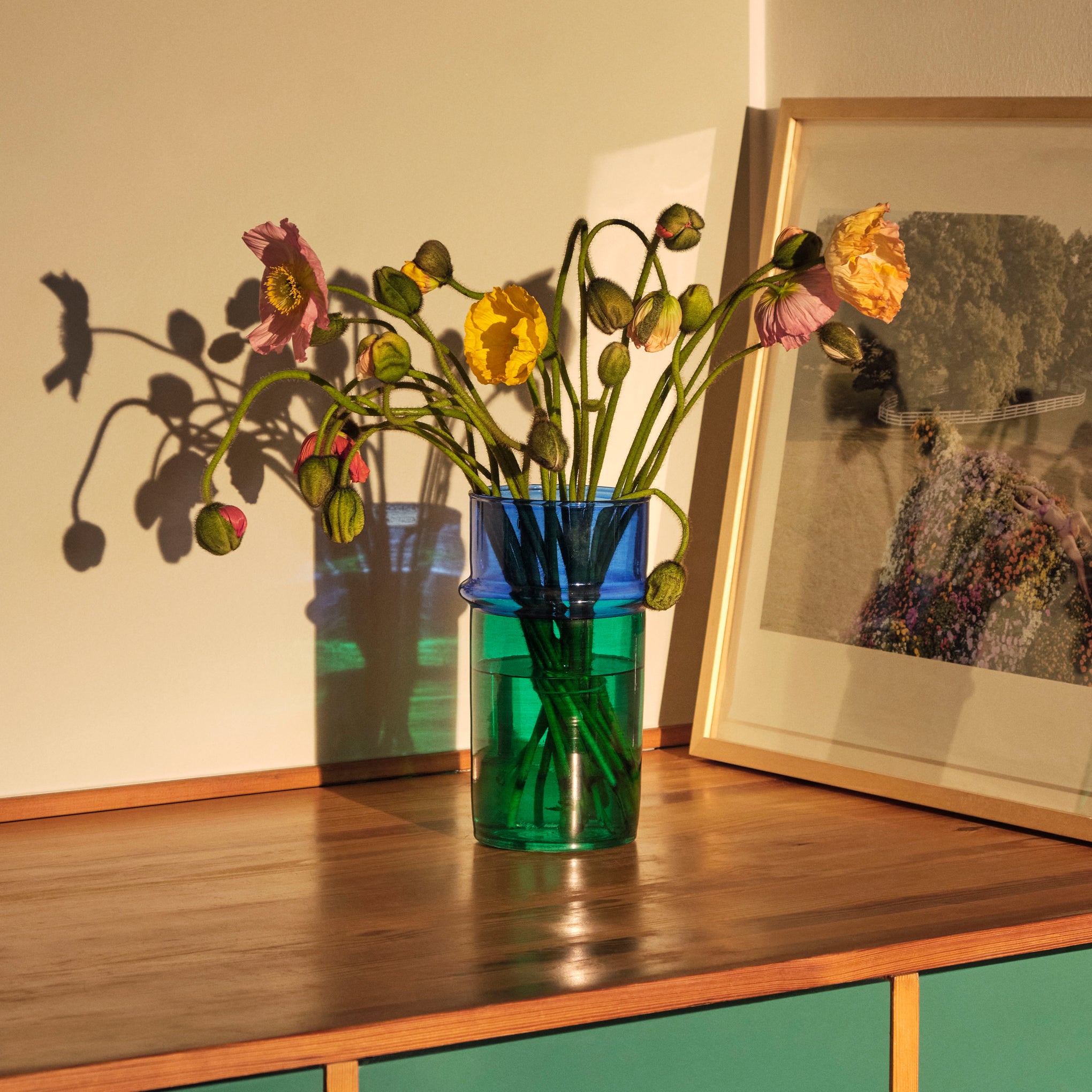 HAY. a manufacturer in MoMA’s collection. has reinvented the vase with these color-blocked statement makers. Crafted in Morocco from recycled hand-blown glass which is then painted. this weighty piece is ideal for dramatic flower arrangements.