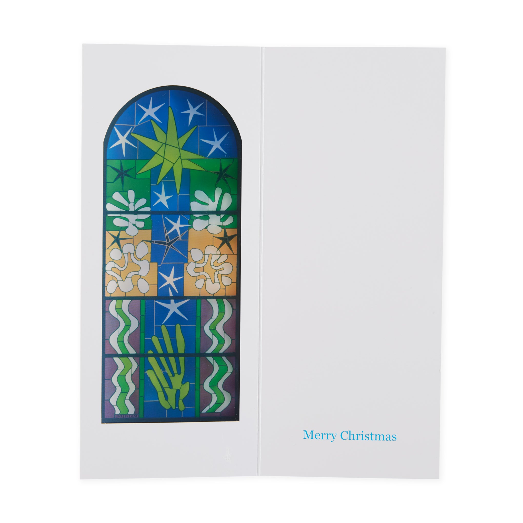 MoMA Exclusive: This set of eight holiday cards features a reproduction of Henri Matisse’s stained-glass work Nuit de Noël. Paris. summer-fall 1952. an artwork in MoMA’s collection that is on view in the Museum’s galleries. The card is produced on acetate to convey the beauty and feeling of the original stained-glass window. allowing light to flow through the acetate surface. Each card measures 8.6h x 3.6w. White envelopes. Set of eight.