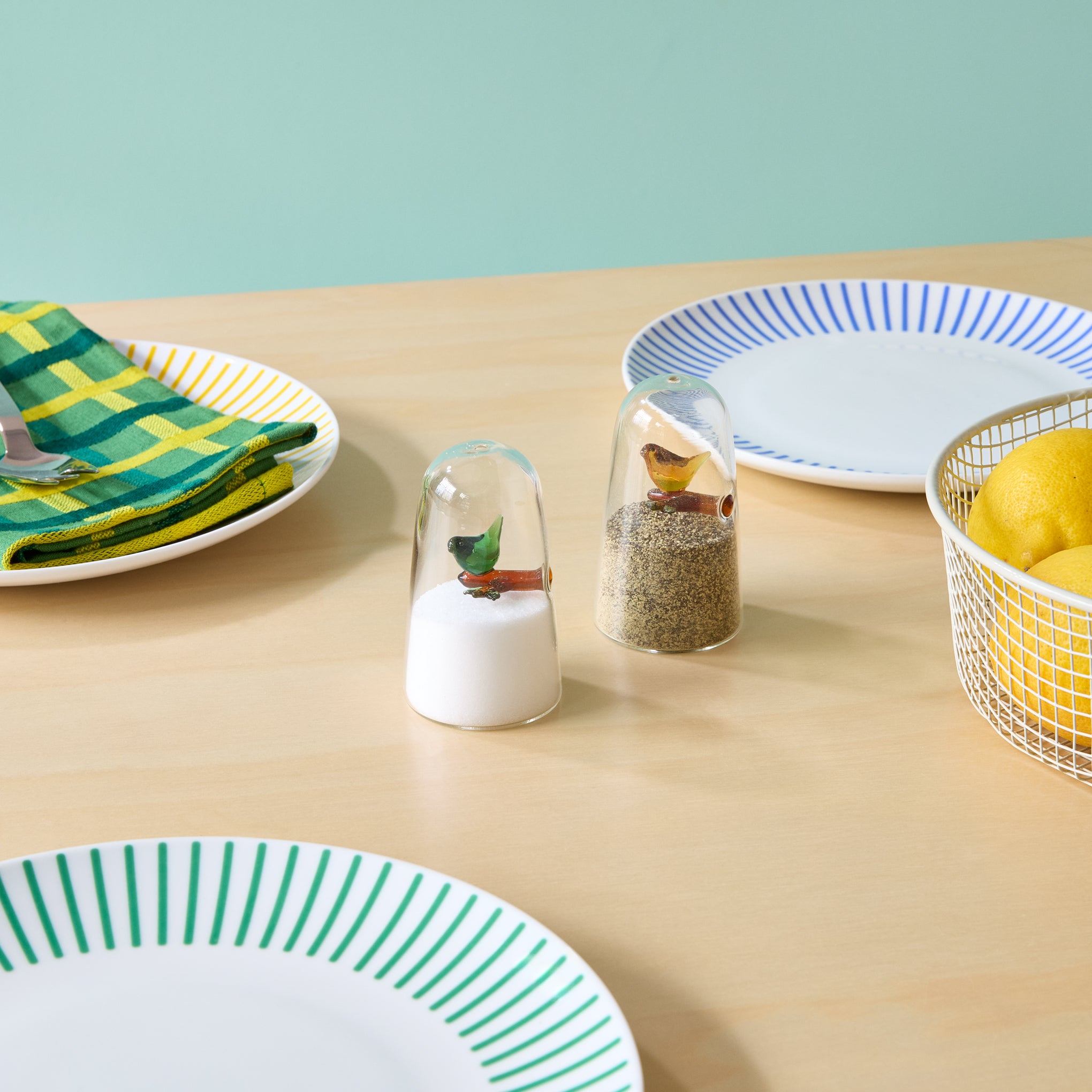 From Ichendorf Milano. the brand known for whimsical glass designs. comes this set of sweet shakers. A green and yellow bird are each perched on a branch inside a pair of clear glass domes which are easy to fill with salt or pepper. Delightful accents for your table and everyday meals. the shakers are crafted from durable borosilicate glass. Each Bird Salt & Pepper Shaker measures3h x 2diam.
