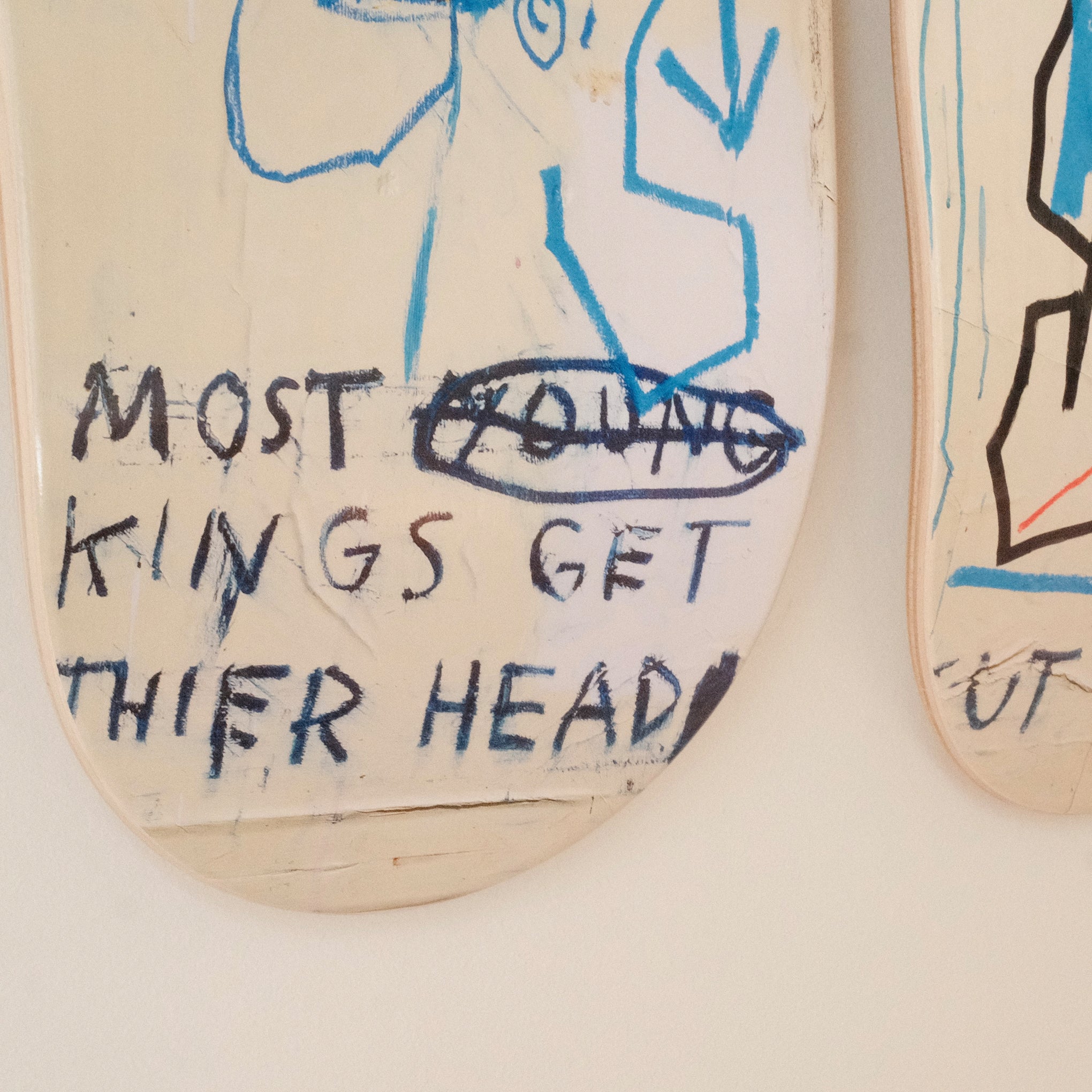 1980s art icon and native New Yorker Jean-Michel Basquiat was hailed for works that draw on a multivalent range of sources. from Greek. Roman. and African art to jazz. pop culture and his artistic contemporaries. Before he rose to art stardom. however. his work was already legendary on the streets of downtown NYC. Under the tag SAMO©. Basquiat’s fragmented poetry and poignant symbols established a visual vocabulary that continues to inspire a new generation of graffiti artists today. Jean-Michel Basquiat Charles the First is a set of three skate decks made in collaboration between The Skateroom and The Estate of Jean-Michel Basquiat. Basquiat’s work is represented in MoMA’s collection.