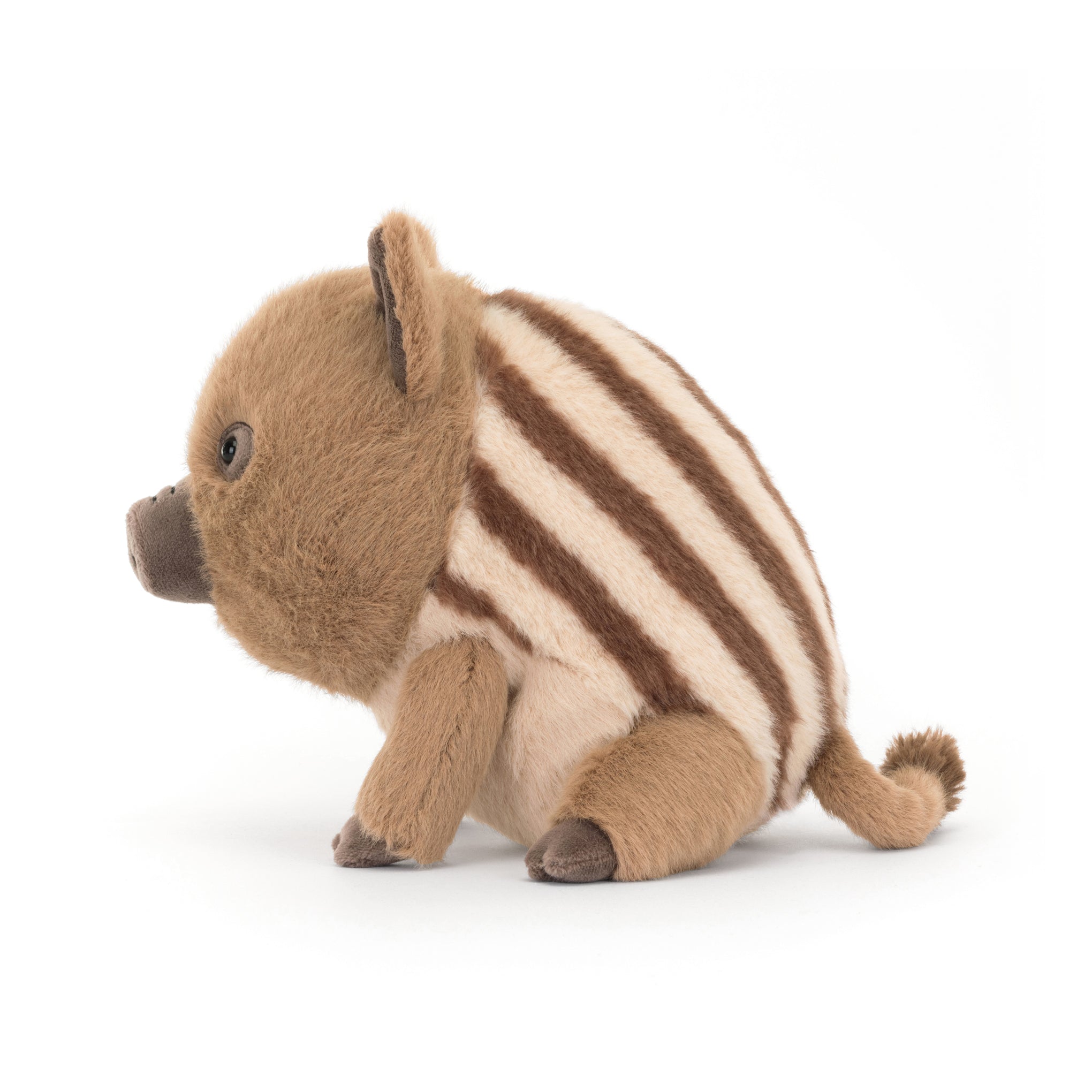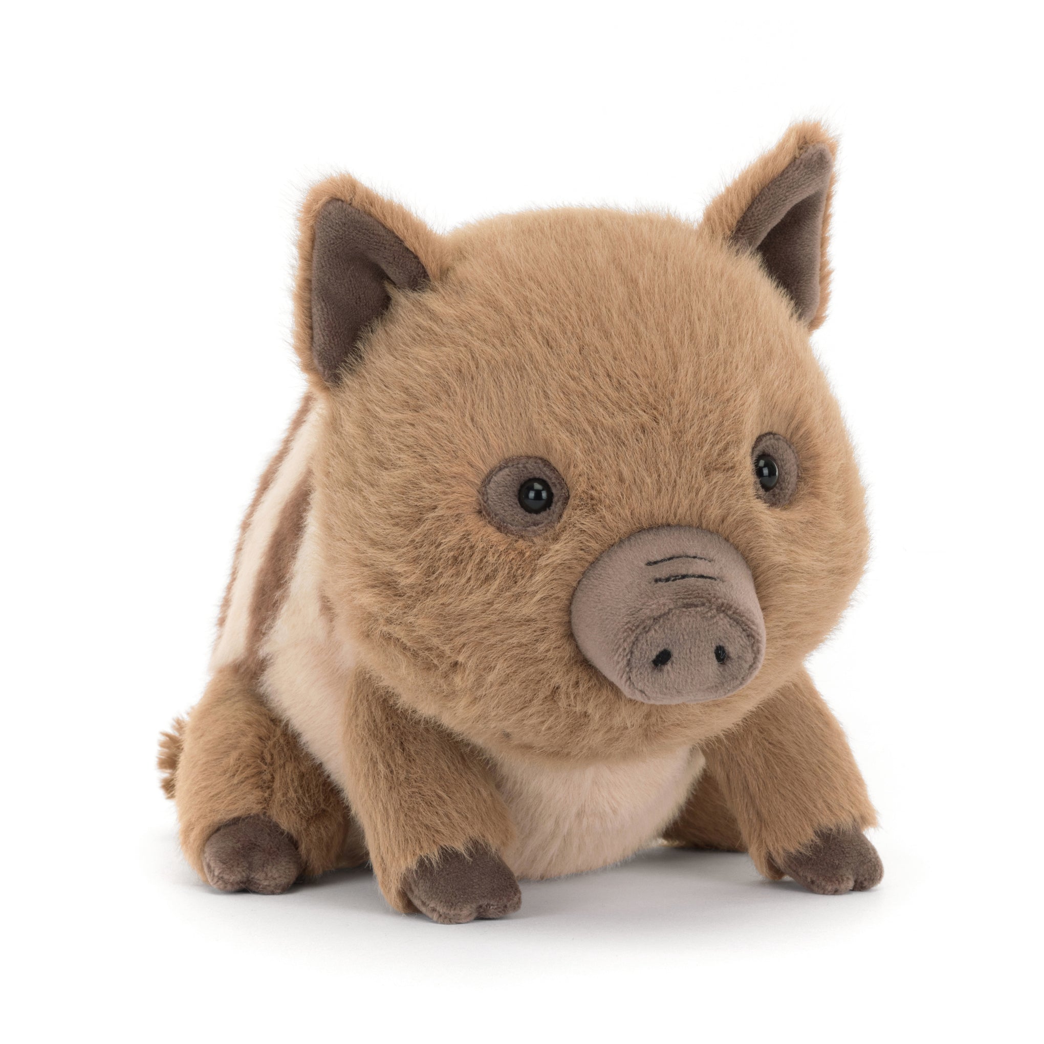 This adorable plush pig. Swinley Boar. comes to you from London-based Jellycat. Ready to be your little one’s best pal. has a brown and cream striped body. a cute snout and cloven hooves. To care for the Jellycat Swinley Boar Plush Toy. wash it by hand and do not tumble dry. For ages 0+.