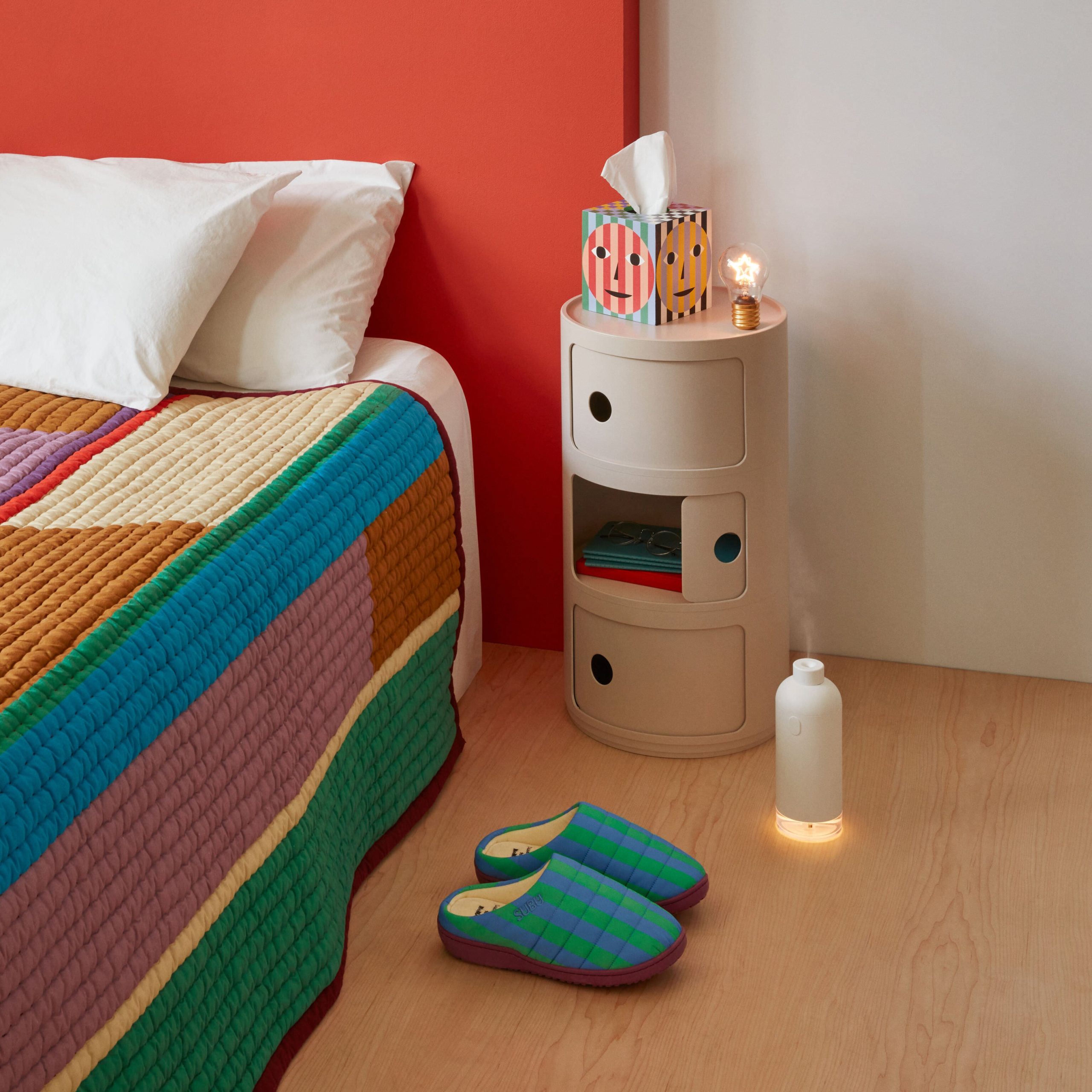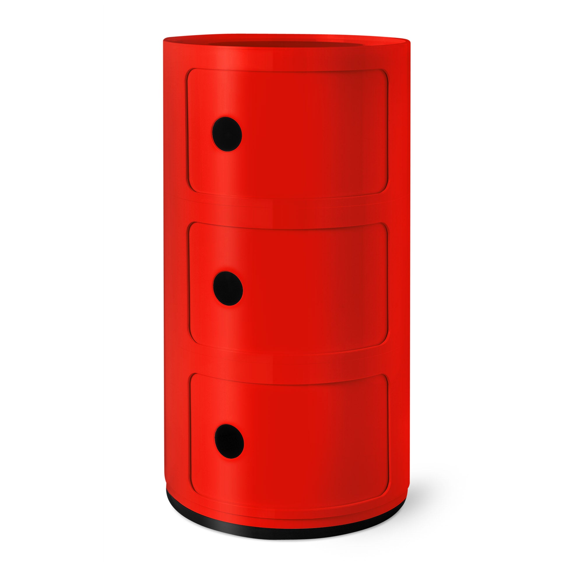 The  Componibil 3-Tier can be used anywhere throughout the home or office as a side table and for storage. It’s useful for holding items such as housewares. cosmetics. towels. toys. books. tools. electronics and more. The tongue-and-groove design allows the doors to seamlessly slide open. It has a round shape with a recessed top and three shelves with sliding doors that have holes for easy opening. Comes fully assembled. The Componibili 3-Tier Storage is made in Italy by Kartell. which was cofounded by Ferrieri in 1949 and has work in MoMA’s collection. Please note that the Componibili is not meant to be stacked.