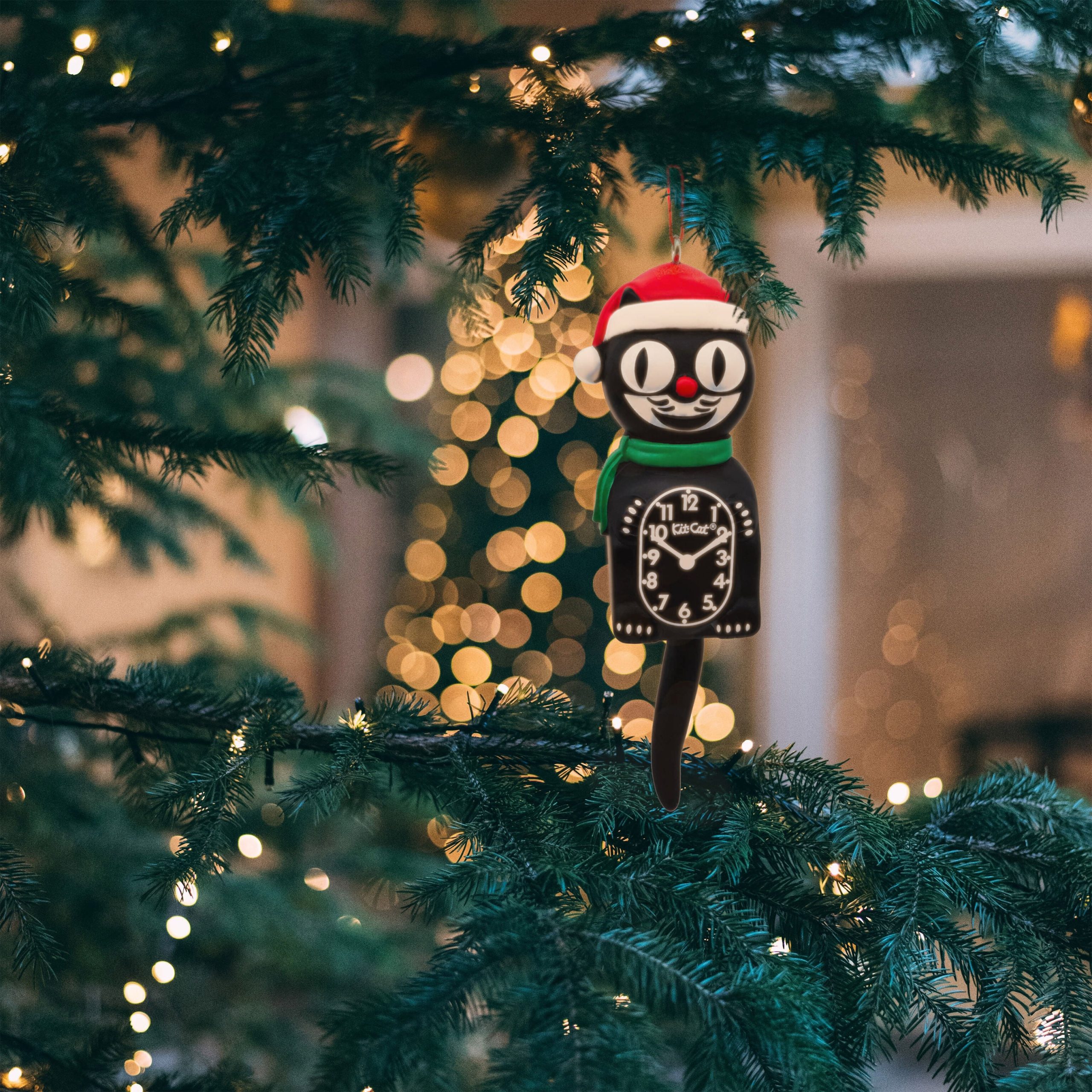The Kit-Cat Clock. an American pop culture icon for over 80 years. is now a holiday ornament! Donned in a Santa Claus Hat. this cute ornament will make everyone smile when they see it on your Christmas tree. The Kit-Cat Clock is made from polyresin and measures 4.25h x 1w.