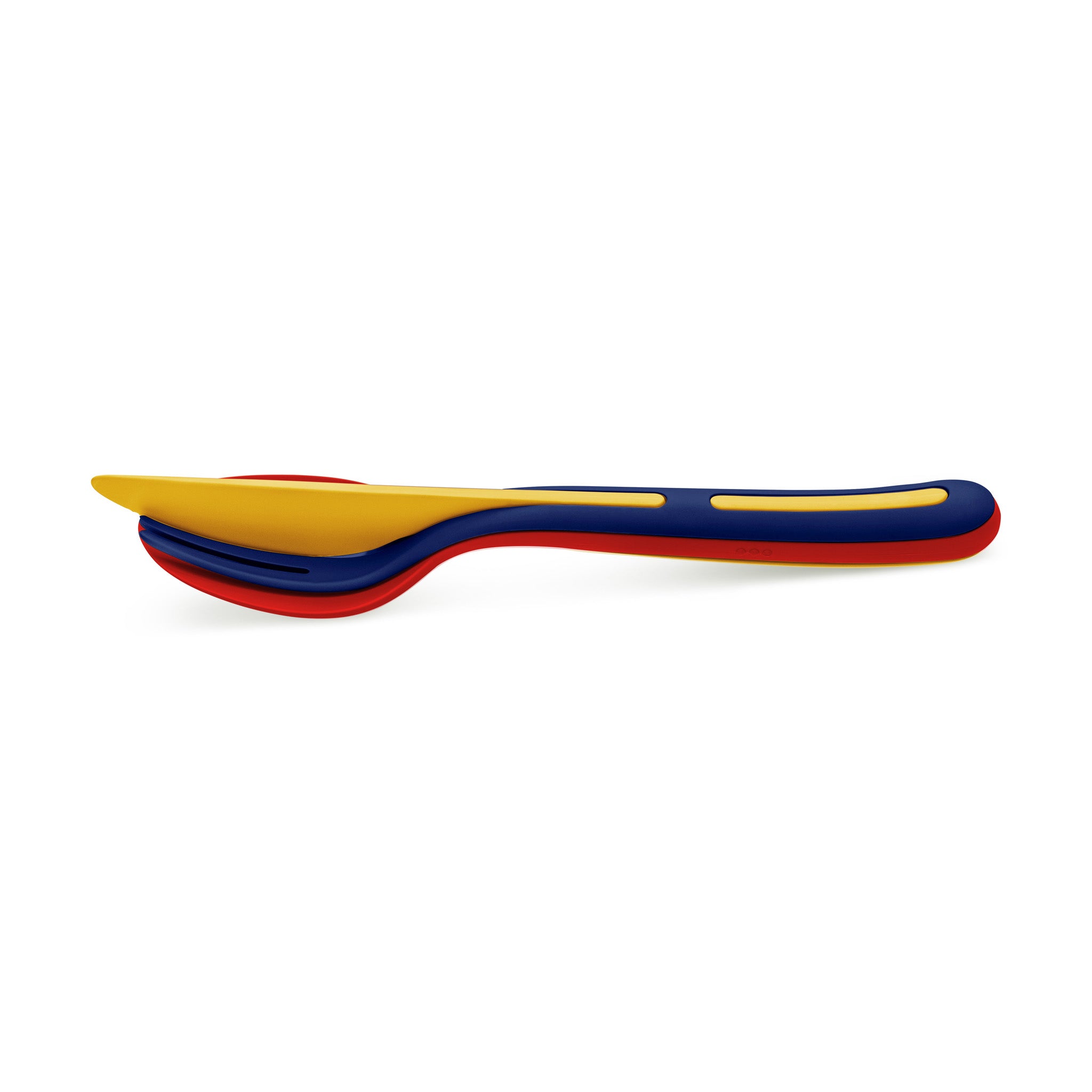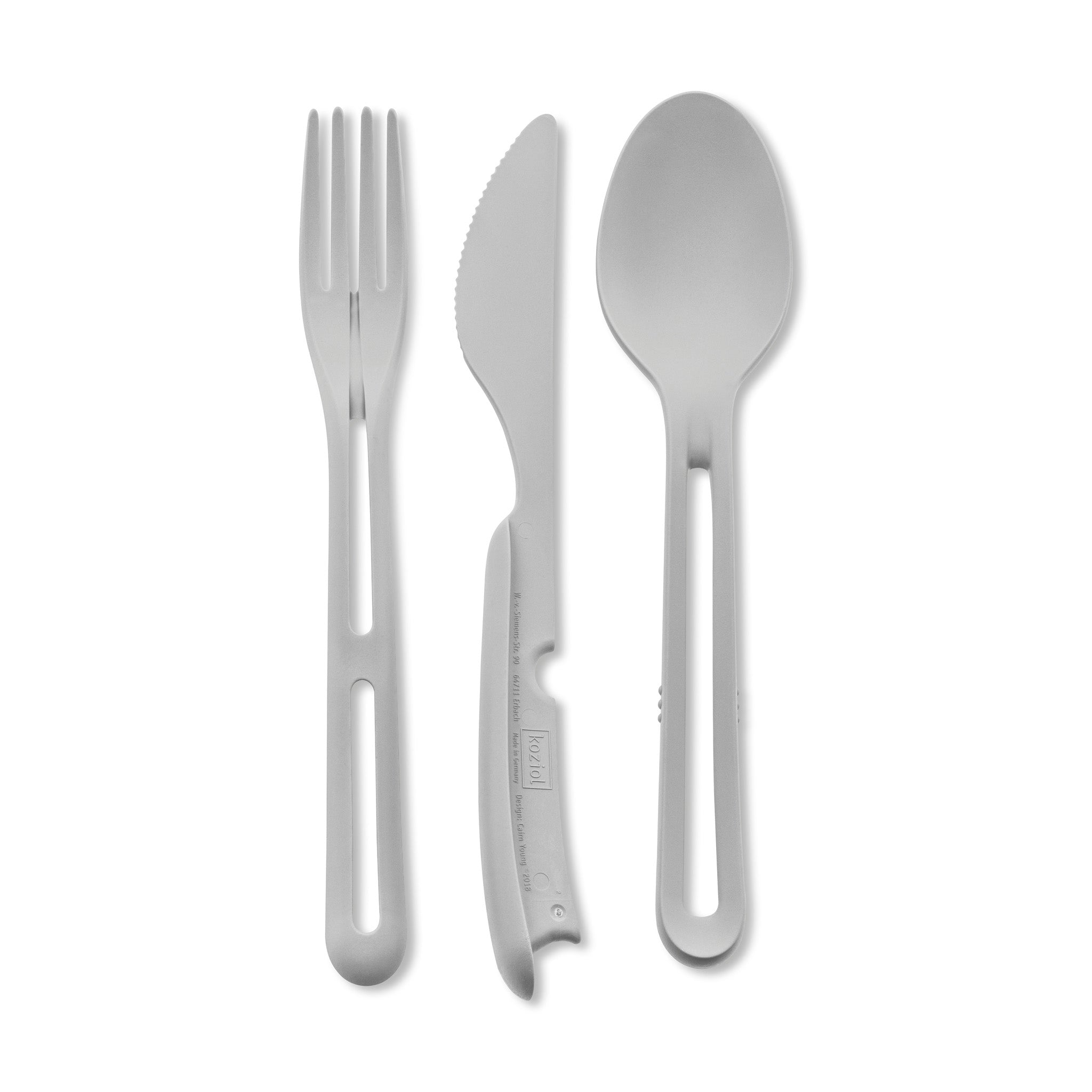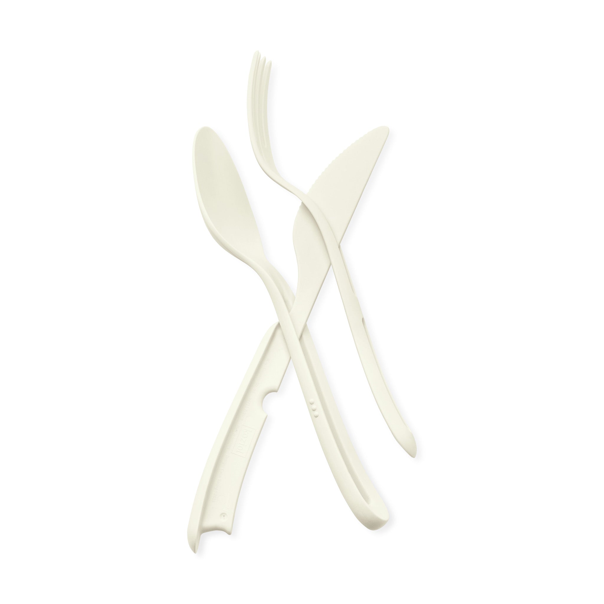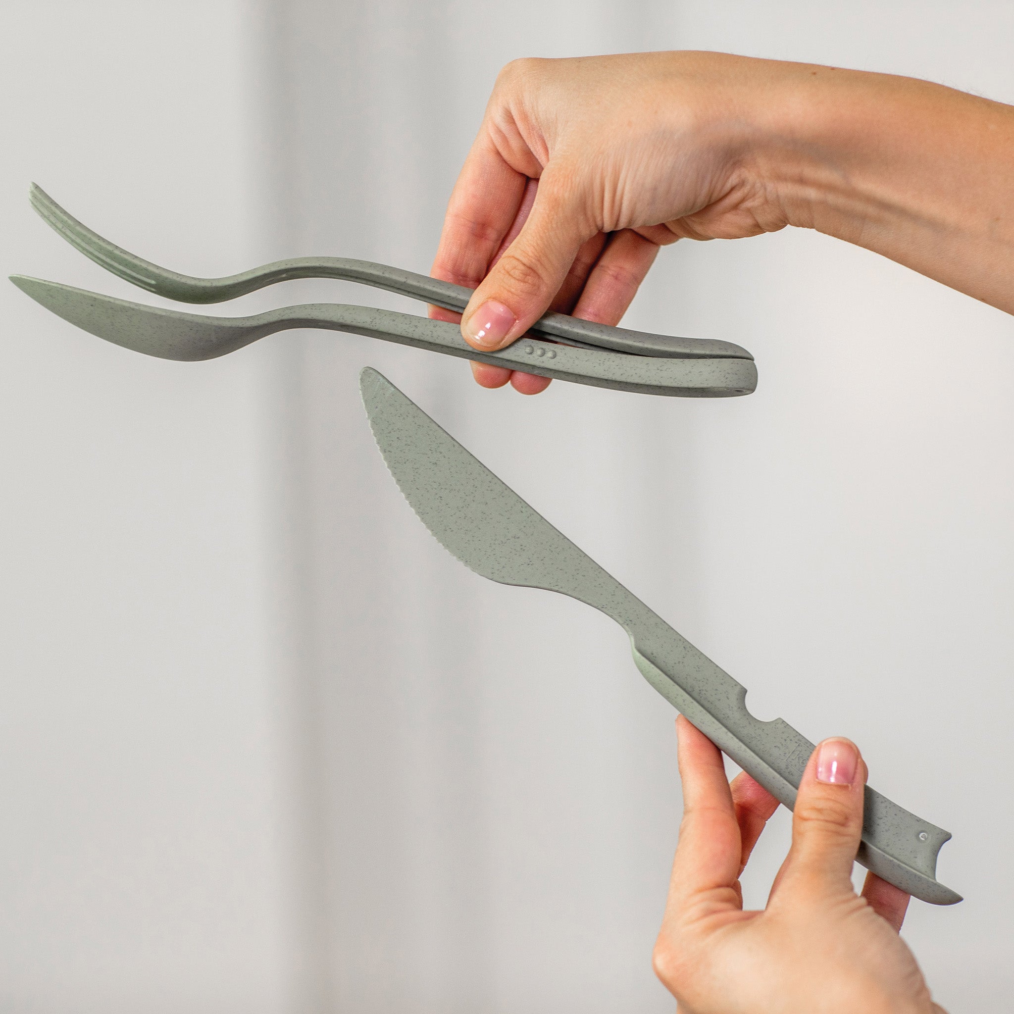 Cleverly designed to fit together in a compact. on-the-go package. this reusable. three-piece Klikk Flatware Set includes a knife. fork and spoon. and is a smart alternative to disposable plastic. Ideal for meals at work or weekend picnics. the 8.75 long Klikk Cutlery Set is made in Germany from 100% recyclable and sustainable thermoplastic. The pieces are dishwasher-safe and heat-resistant to 428??F (220??C).