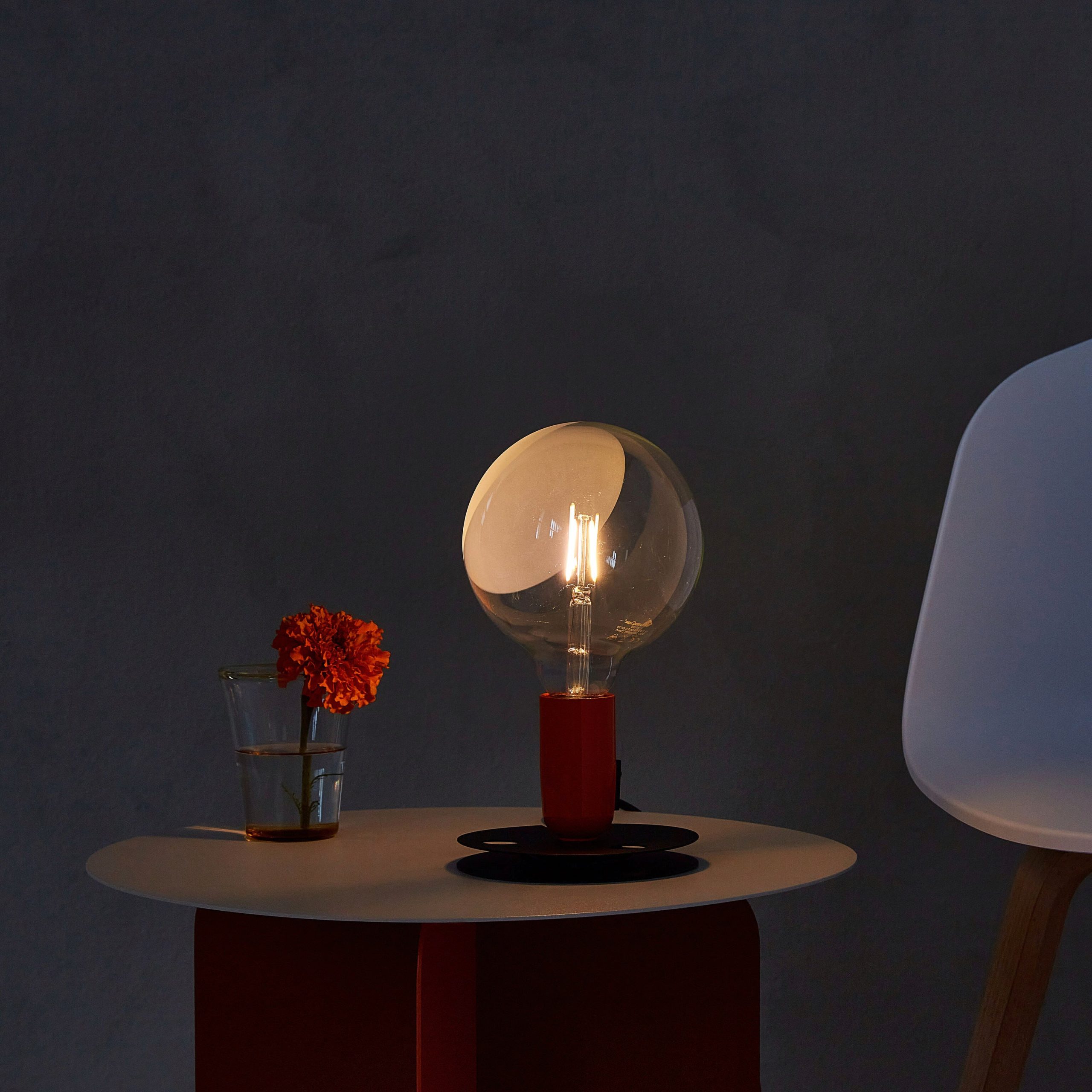 Designed by Achille Castiglioni in 1972 and an object in MoMA’s collection. the Lampadina Table Lamp combines a bulb that has a science-lab feel with a stand that evokes a film reel. In Italian. lampadina literally means light bulb and for this design. Castiglioni played with the concept of light through a decidedly meta recreation of a light bulb. The Lampadina’s clear bulb provides direct lighting. although a portion of it has been sandblasted to create a frosted circle that casts a more diffused light. The anodized aluminum base contains the excess power cord and the lamp is powered by a standard plug-in. Achille Castiglioni has work in MoMA’s collection. The Lampadina Table Lamp measures 9.4h x 4.9diam. with a 90 black cord. Bulb included. Made in Italy.