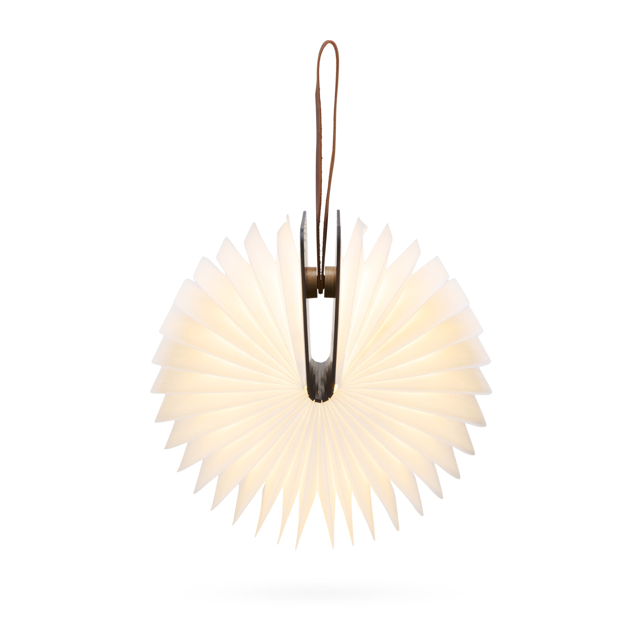 The strong neodymium magnets imbedded within its covers allow this transformable light to be expanded 180 degrees to its fullest brightness. or mounted upon any magnetic surface. The included leather hanging strap enables lightweight Lumio to be suspended. offering ambient light akin to a lustrous paper lantern. A rechargeable lithium-ion battery provides wireless power for up to eight hours (rechargeable via USB -C cord using a 2A or 3A adaptor). Brightness: 500 lumen. Light temperature: 2700K (warm white). Wipe clean with a damp cloth. The Lumio Book Lamp is featured in the Kickstarter@MoMA Design Store collaboration. and was brought to life by 5.276 backers on Kickstarter.