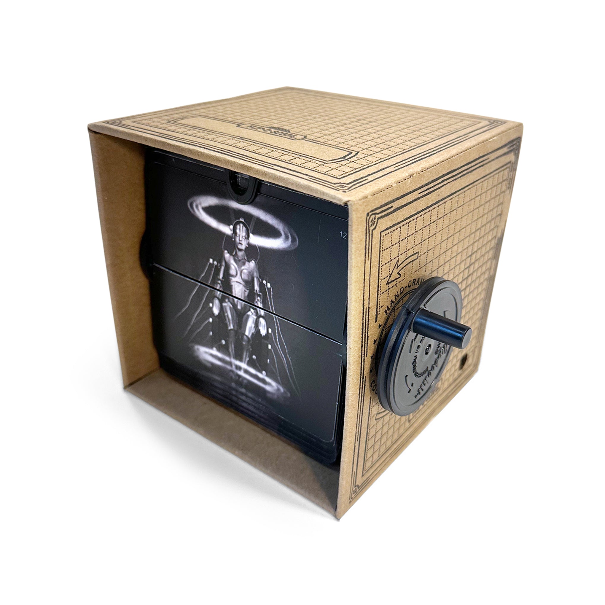 Put away those digital screens and indulge in this retro hand-cranked movie machine. The DIY FlipBookIt Flipscope displays motion art as you turn the handle—and this special edition includes image cards from Fritz Lang’s iconic 1927 silent film Metropolis. a work in MoMA’s collection. The cards illustrate one of the film’s most famous moments: Maria’s Transformation. the spectacular birth of a woman humanoid robot in the laboratory of the villainous inventor Rotwang. The Metropolis DIY FlipBookIt Flipscope measures 5h x 5w x 5d. For ages 7+.