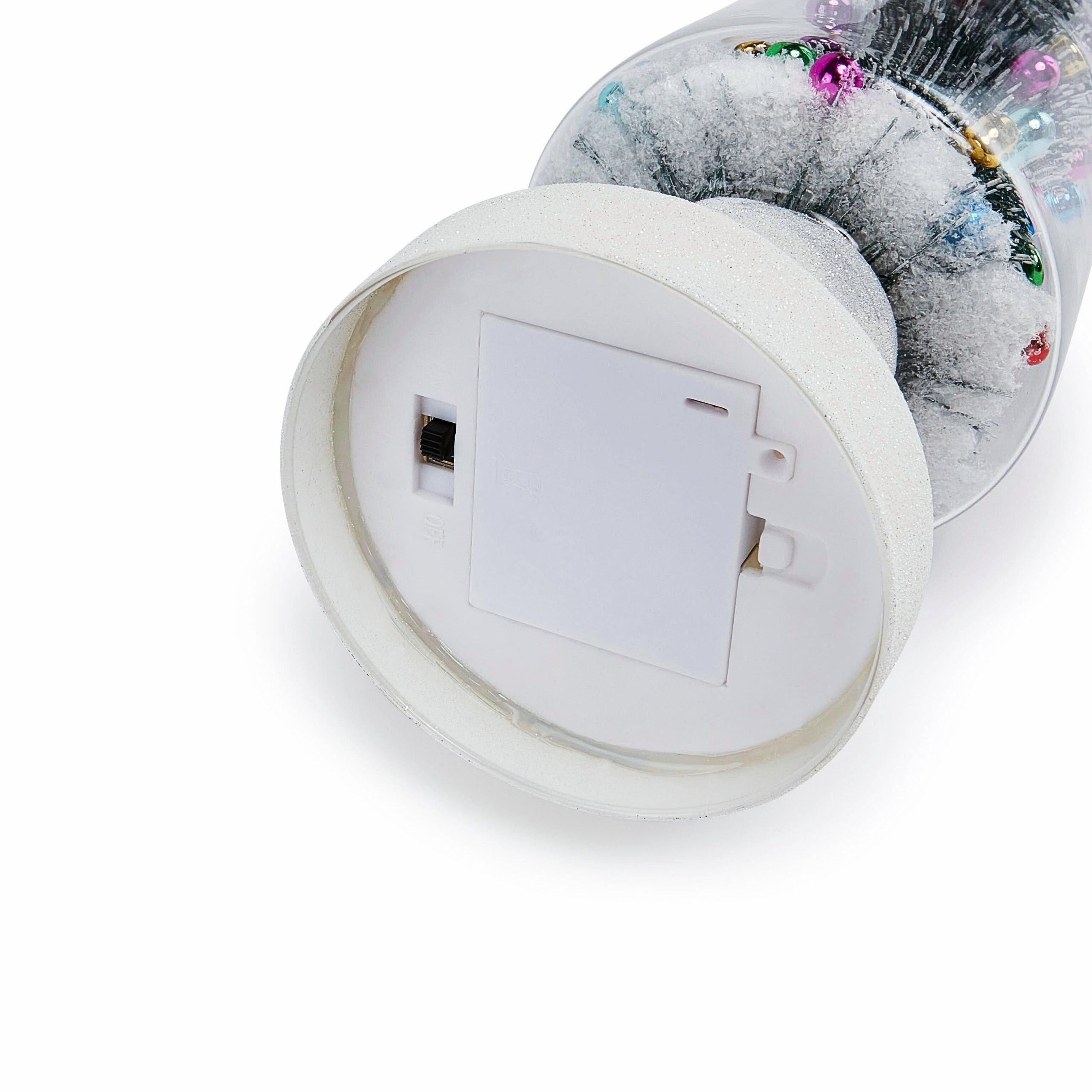 Bring a glowing. snowy landscape to your holiday festivities. LED lights inside this glass tree highlight the snow-covered tree within. Requires three AA batteries (not included). The LED Snowy Wonderland Glass Lighted Large Tree measures 20h x 4w. A smaller version of this design is available here.