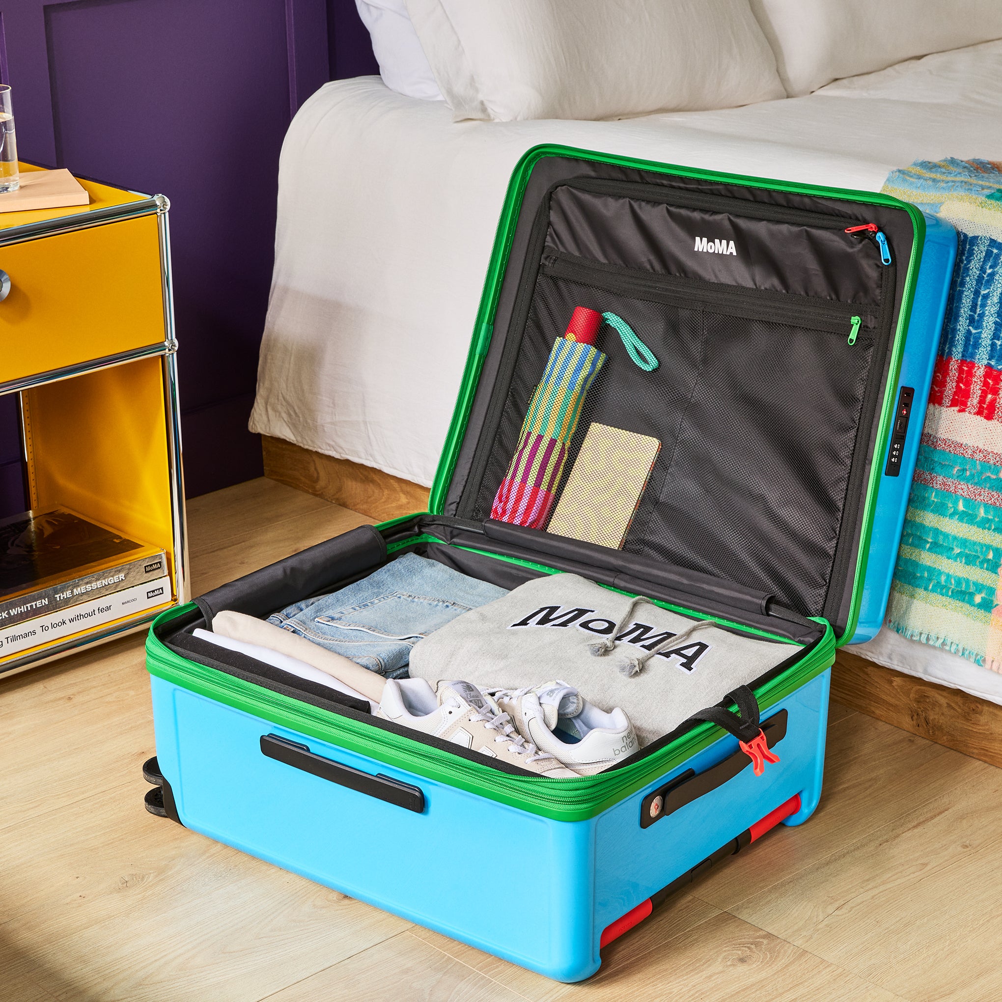 MoMA Exclusive: Enhance your trips near and far with the MoMA Expandable Suitcase made in collaboration with South Korean luggage brand Rawrow that was founded in 2012. This style was designed exclusively for us in bright blue with green and orange trim. and has our logo placed subtly on the front and interior. Available in two sizes. the sleek hardshell style fits essentials for both short and long stays. It also easily expands to accommodate that sudden increase in items we all experience during our travels. Conveniently hang your bags on Rawrow’s innovative TT Handle™ that’s effortlessly easy to grasp.