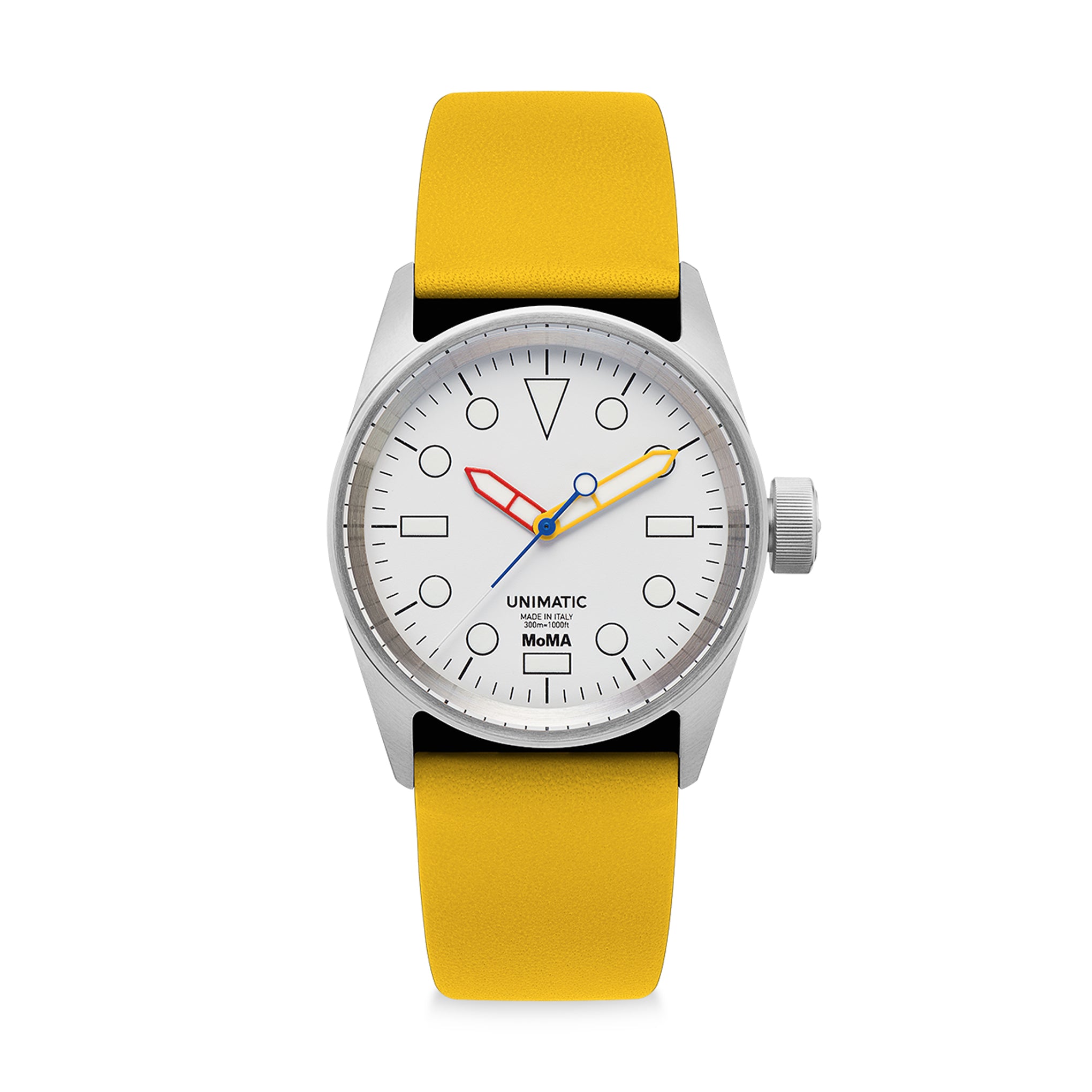 MoMA Exclusive: Inspired by the straight lines. rectangular planes. and primary colors of the De Stijl movement. this MoMA Unimatic De Stijl Modello Cinque Watch is the perfect timepiece for any art appreciator. As Unimatic’s first and most popular model. the minimalist Modello Uno takes inspiration from archetypal dive watches of the 1950s. This particular version. designed exclusively for MoMA. features the MoMA logo on the dial. caseback. and custom watch box. It is available as a limited run of 75 units per each of the three colorways. Each watch comes with two removable straps: one leather in your chosen color. one rubber in black. The watch is equipped with quick-release springbars that gives you the ability to easily fit your strap of choice on your watch and swap it on the go. De Stijl designs are represented in MoMA’s collection. The Unimatic De Stijl Modello Uno Watch has a 36mm case.
