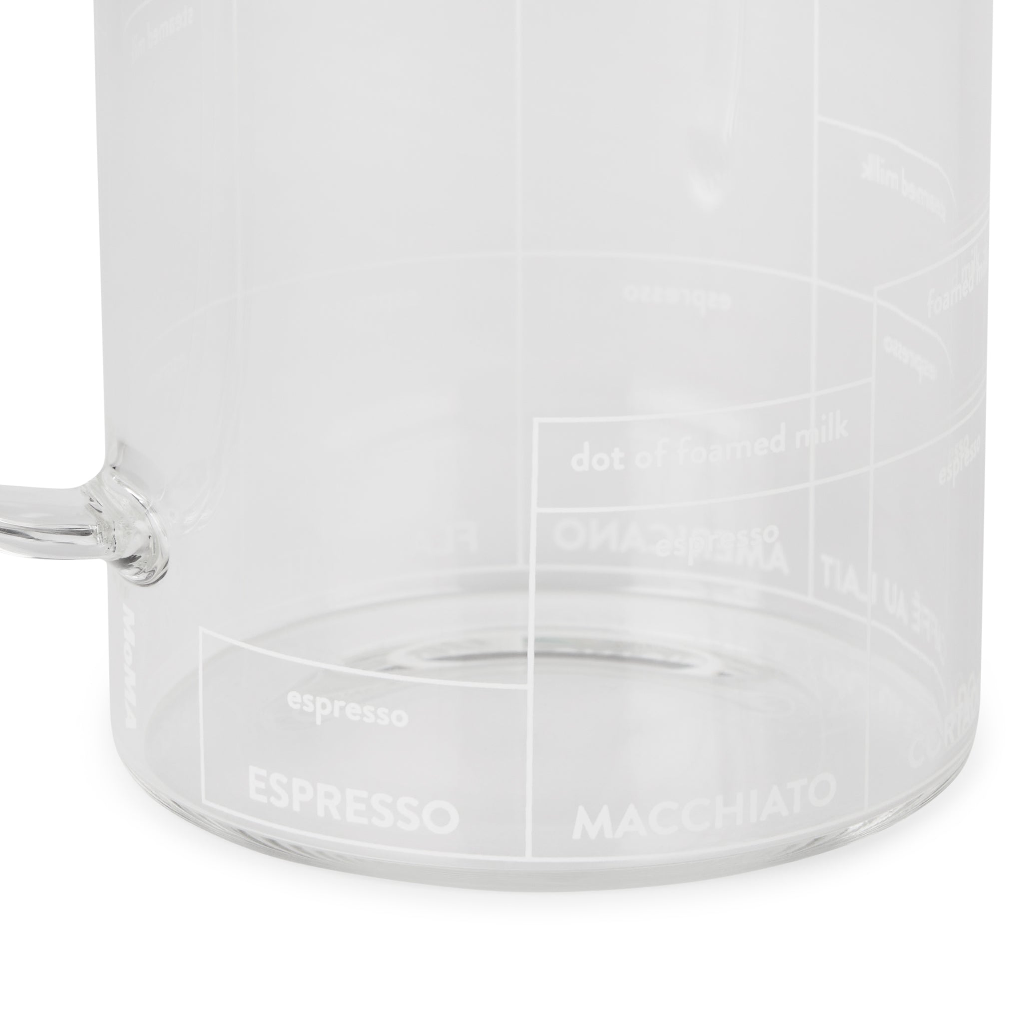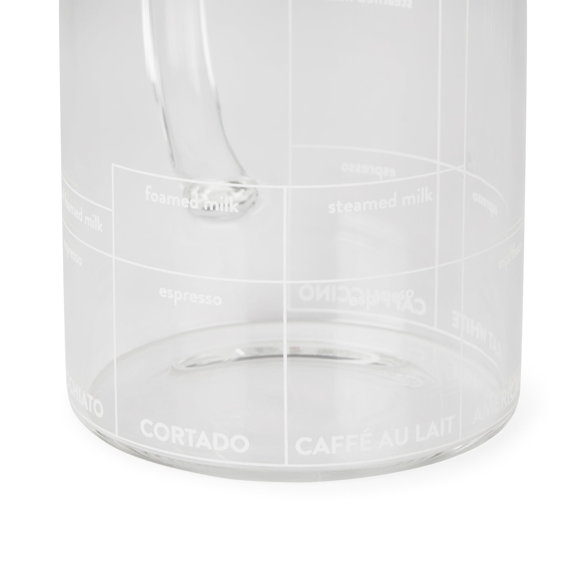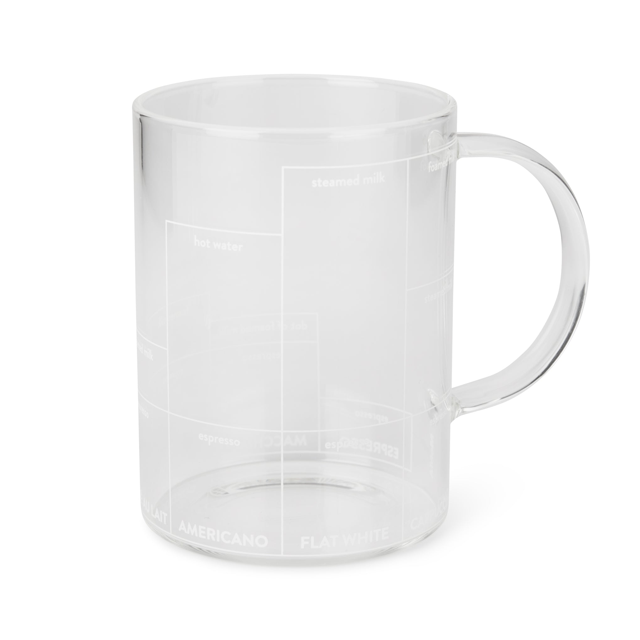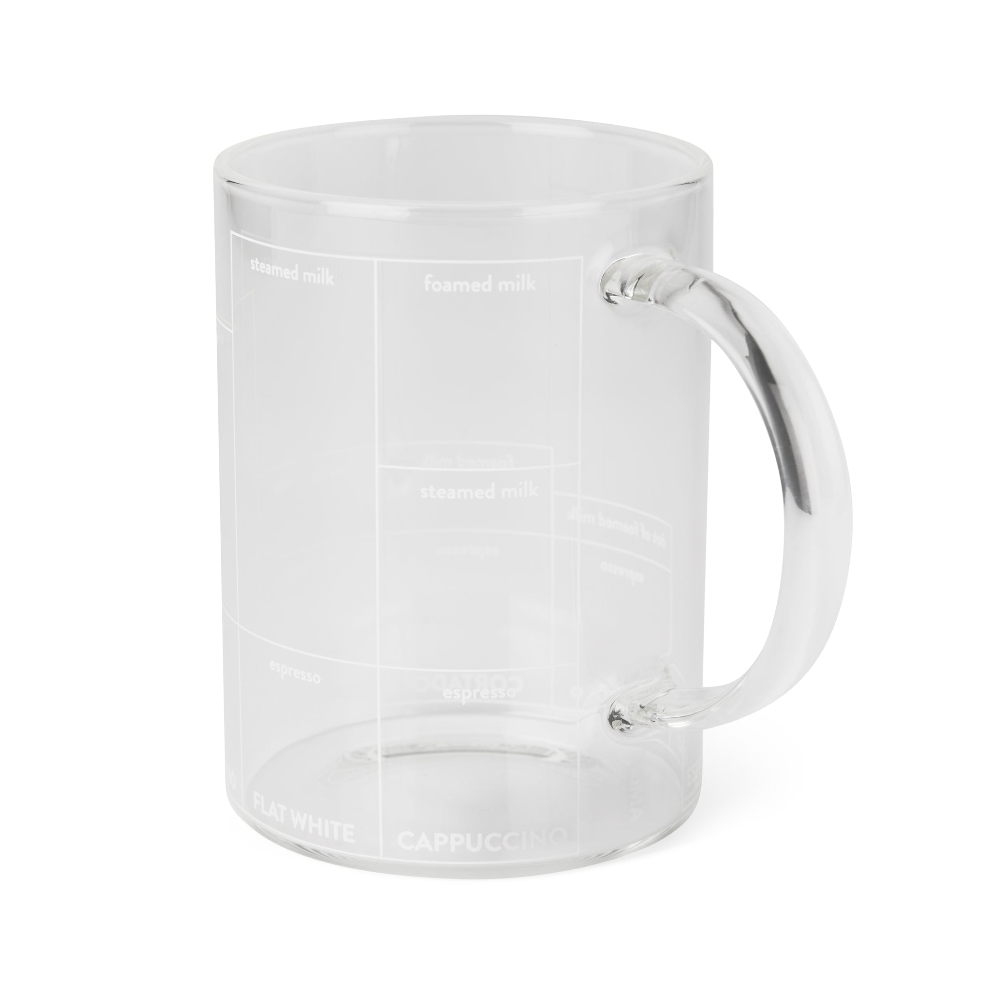This borosilicate glass mug invites coffee drinkers to learn and create various recipes. Measure ingredients and change the proportions of espresso. milk and water using the handy indicators printed on the outside of the mug. Recipes include espresso. macchiato. cortado. caff?? au lait. Americano. flat white and cappuccino. Hand wash only.
