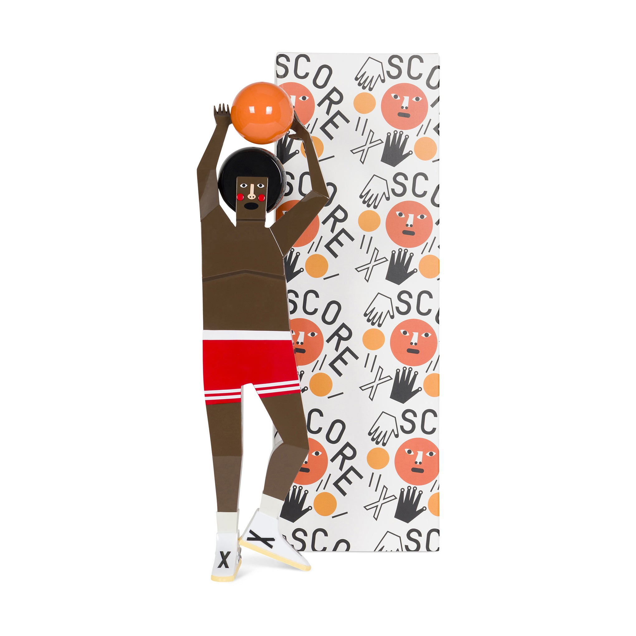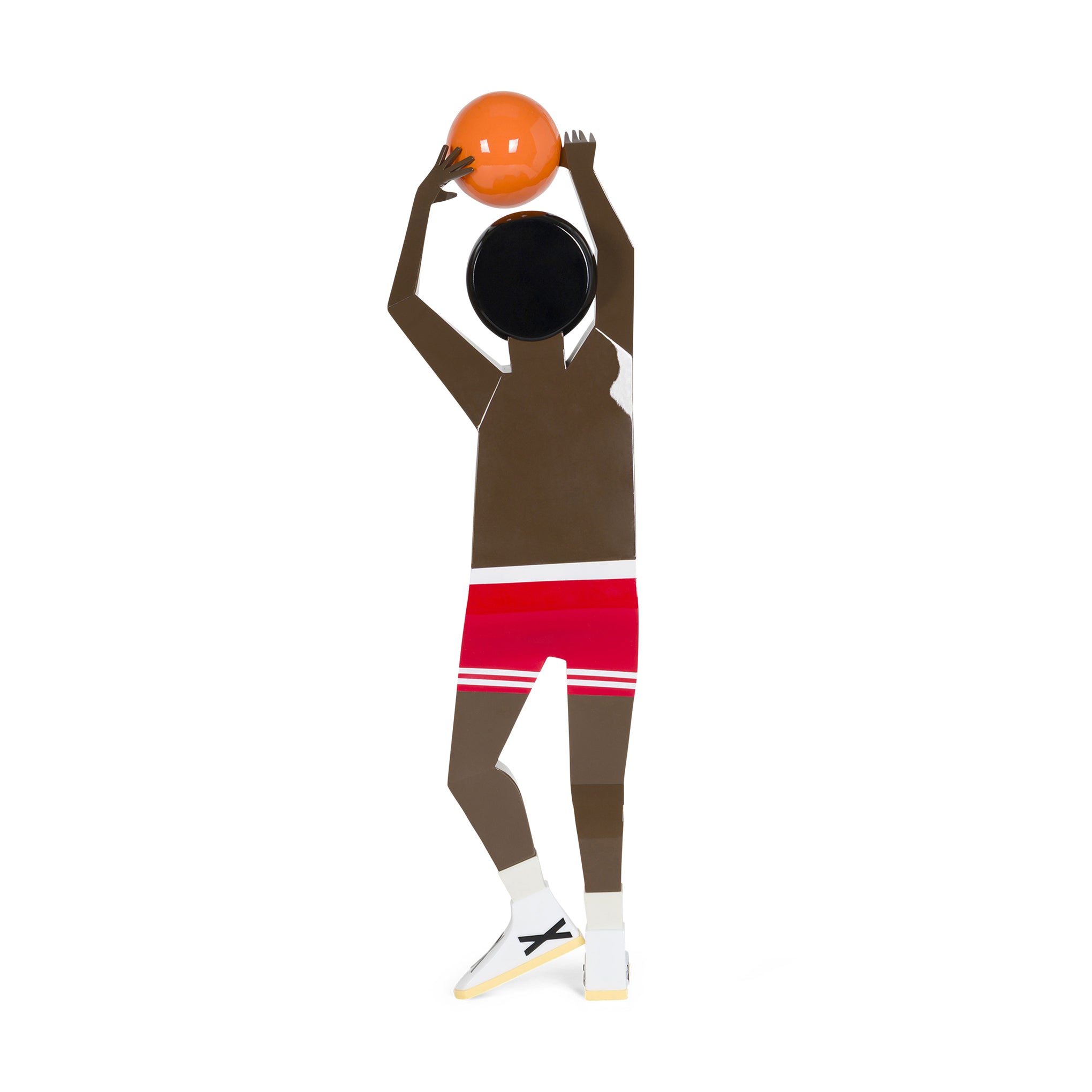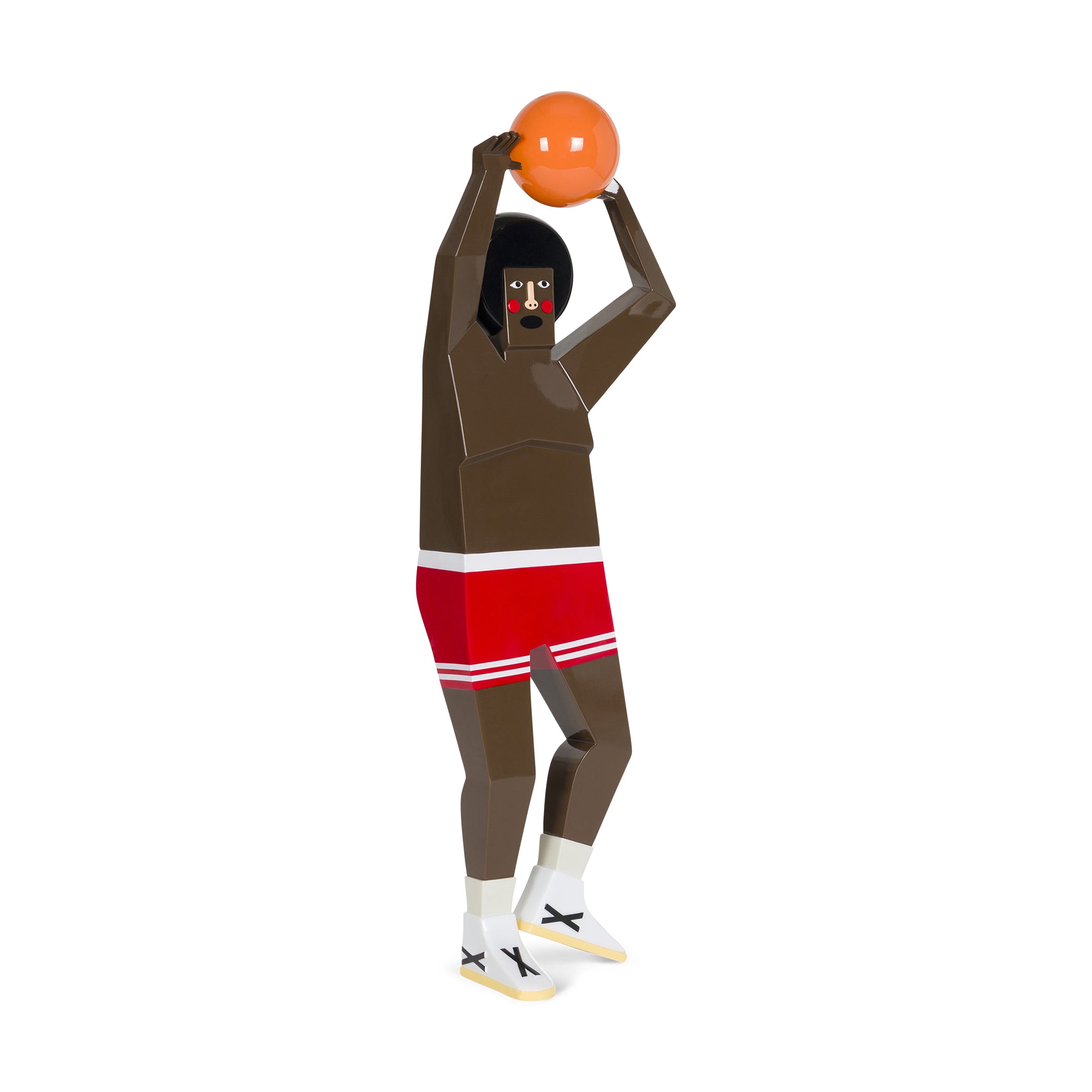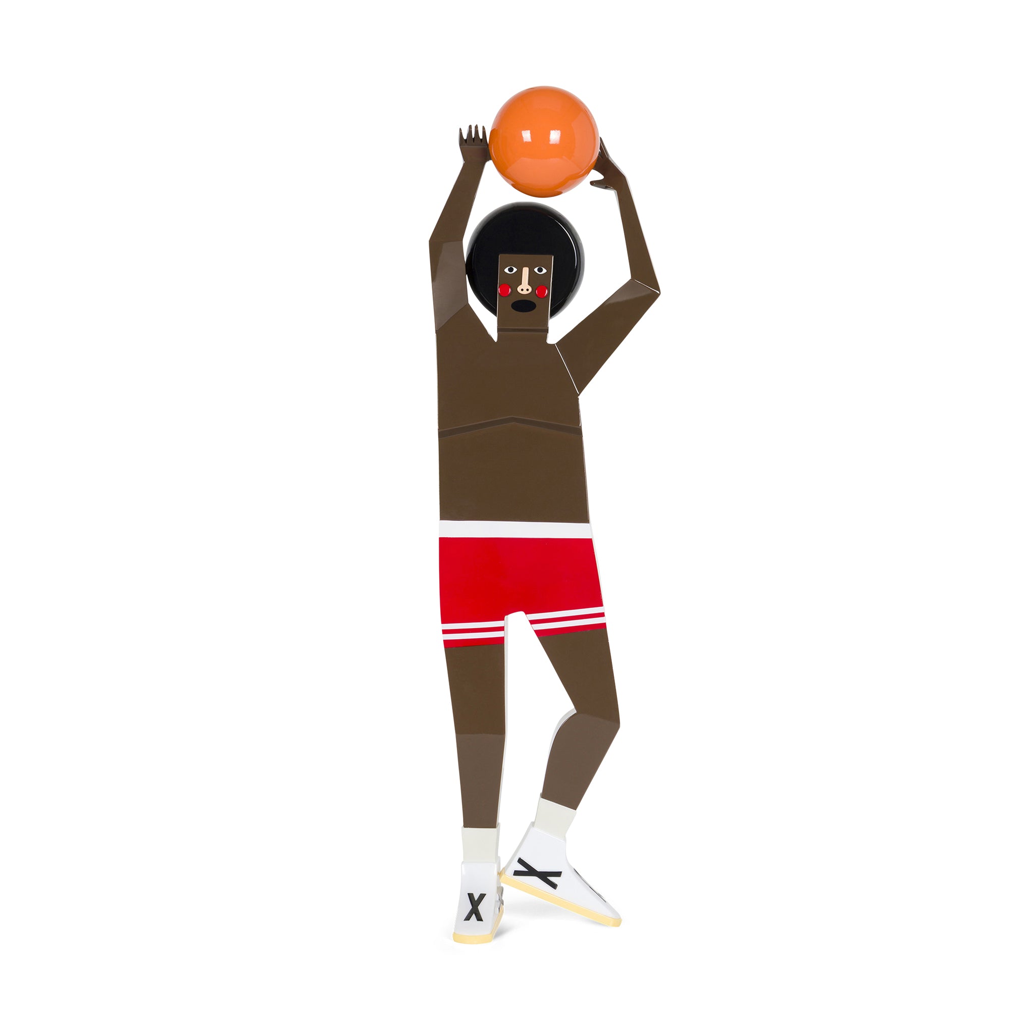 Inspired by classic Starting Lineup figures. this Bravo toy figurine—designed by Nina Chanel Abney. an artist with work in MoMA’s collection—celebrates the everyday icon. the local star. the hero at home. Sculpted in Abney’s bold. cubist-influenced style. Bravo captures a familiar figure in motion. mid-jump shot. with a bright orange basketball held high.