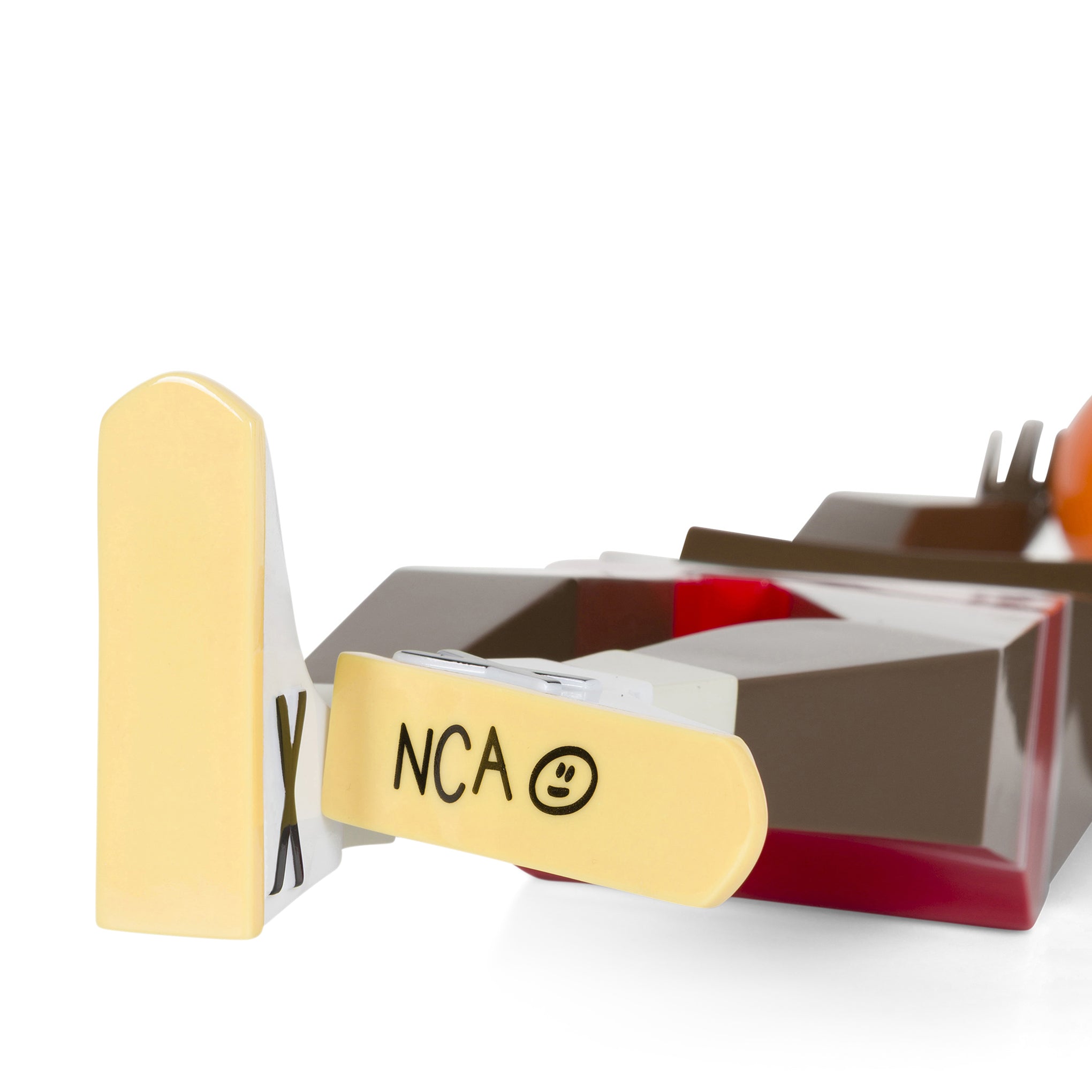 The Bravo figure features angular limbs. simplified geometry. and exaggerated proportions. that reflect Abney’s signature visual language while honoring the quiet exceptionalism found in ordinary people. Dressed in red athletic shorts and white sneakers marked with black Xs. Bravo isn’t a professional athlete. but the one who never missed at the rec center—the cousin. the neighbor. the friend who played like the pros. Each figure comes packaged in a custom box featuring Abney’s illustrated motifs—faces. hands. and the word SCORE—with a glossy ARR Authentication sticker placed on the back. The Nina Chanel Abney Bravo Toy Figurine is made of vinyl and measures 15.25h x 4.1w x 2.65d.