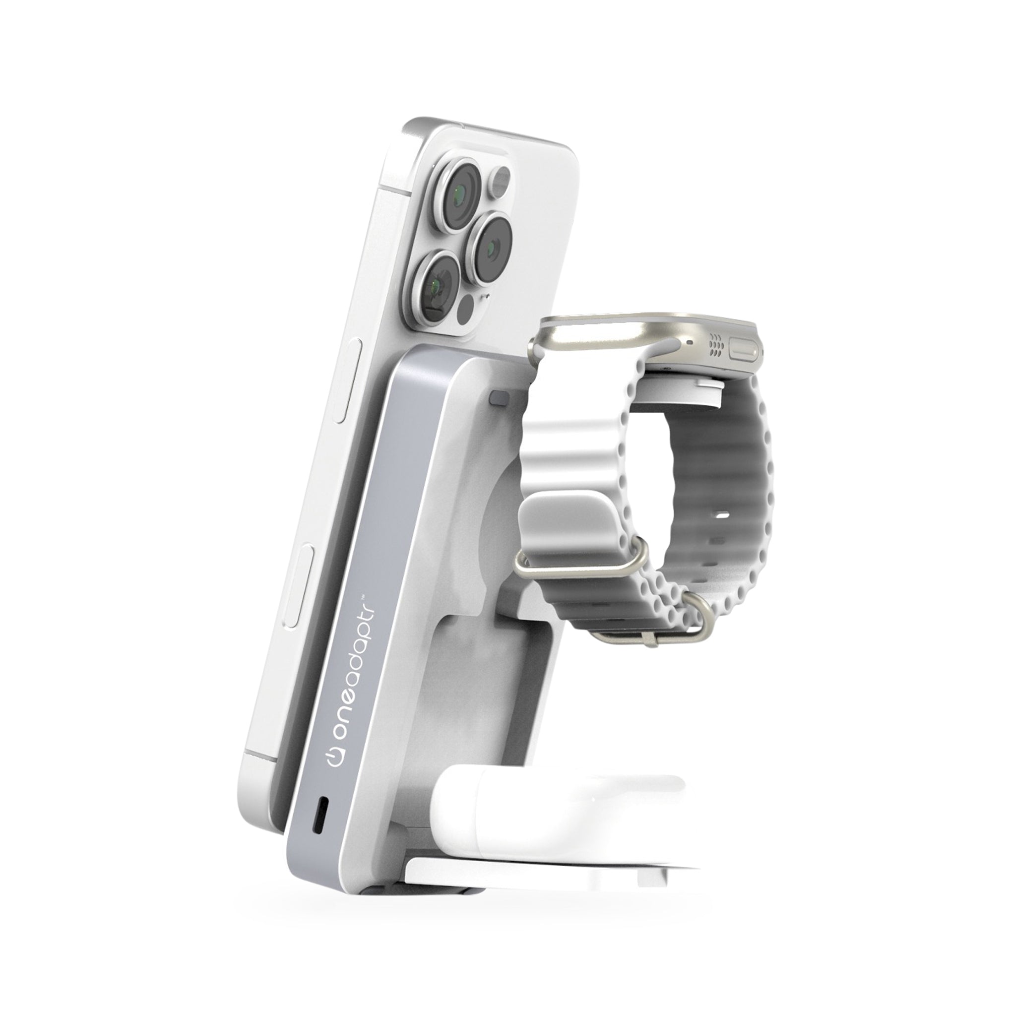 You might never travel with cords again when you bring along this deluxe wireless. folding charging stand that’s also a powerful 10000mAh powerbank. Its 15W. 2W and 5W MagSafe chargers can accommodate your iPhone. Apple Watch and AirPods simultaneously. and its 18W USB-C port can be used to recharge the powerbank or deliver power to another device via cable. Just toss it in your bag and go.