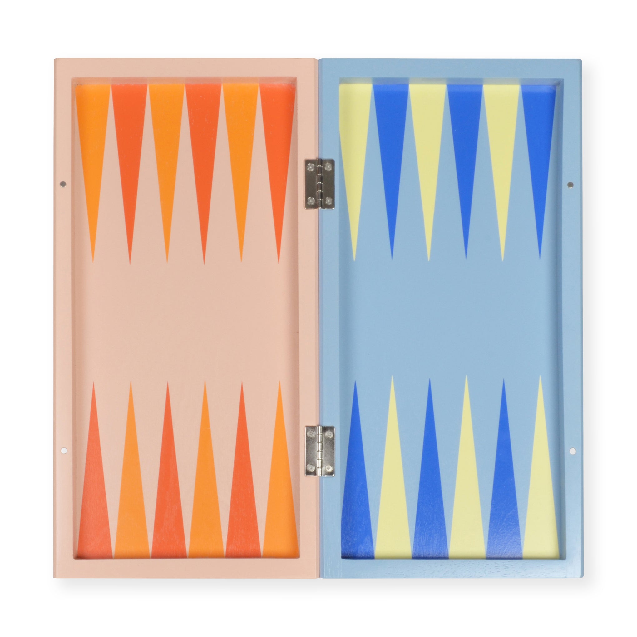 From toys and games designer Panisa Khunprasert. who learned her craft in her family business in Thailand. comes this fresh take on the classic game of backgammon. The board. dice and playing pieces are rendered in unconventional colors??bright pastels. vibrant orange and red??creating a game set you’ll want to leave on display. open or closed. when you’re done playing. The board folds up for easy storage of the dice and pieces. The Panisa Backgammon Set is made from rubberwood and measures 2h x 15.75w x 8d when closed and 1h x 15.75w x 16d when open. Recommended for ages 5+.