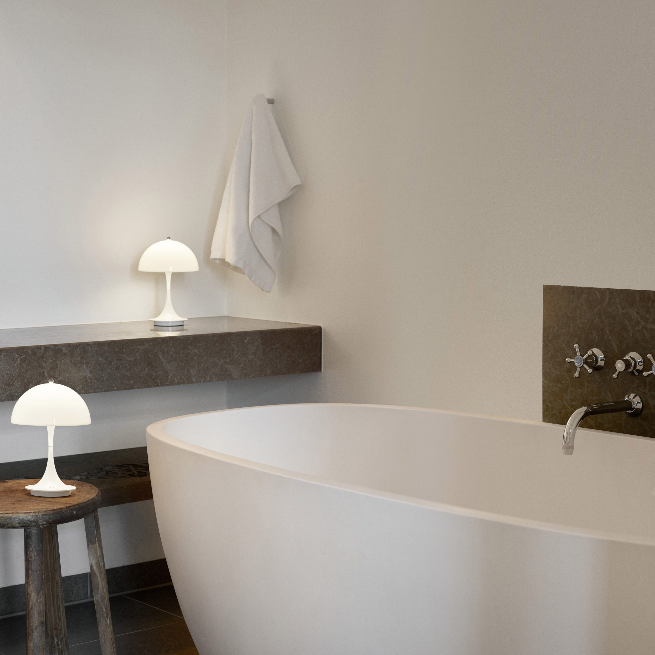 Produced to commemorate the 50th anniversary of Verner Panton’s original 1971 Panthella floor lamp design. this Panthella 160 Portable Table Lamp has a white finish. A wireless design that’s charged via USB-C. the Panthella Mini Portable directs light downwards. The light is then reflected around the room by the lamp’s trumpet-shaped foot. This results in soft. comfortable illumination.