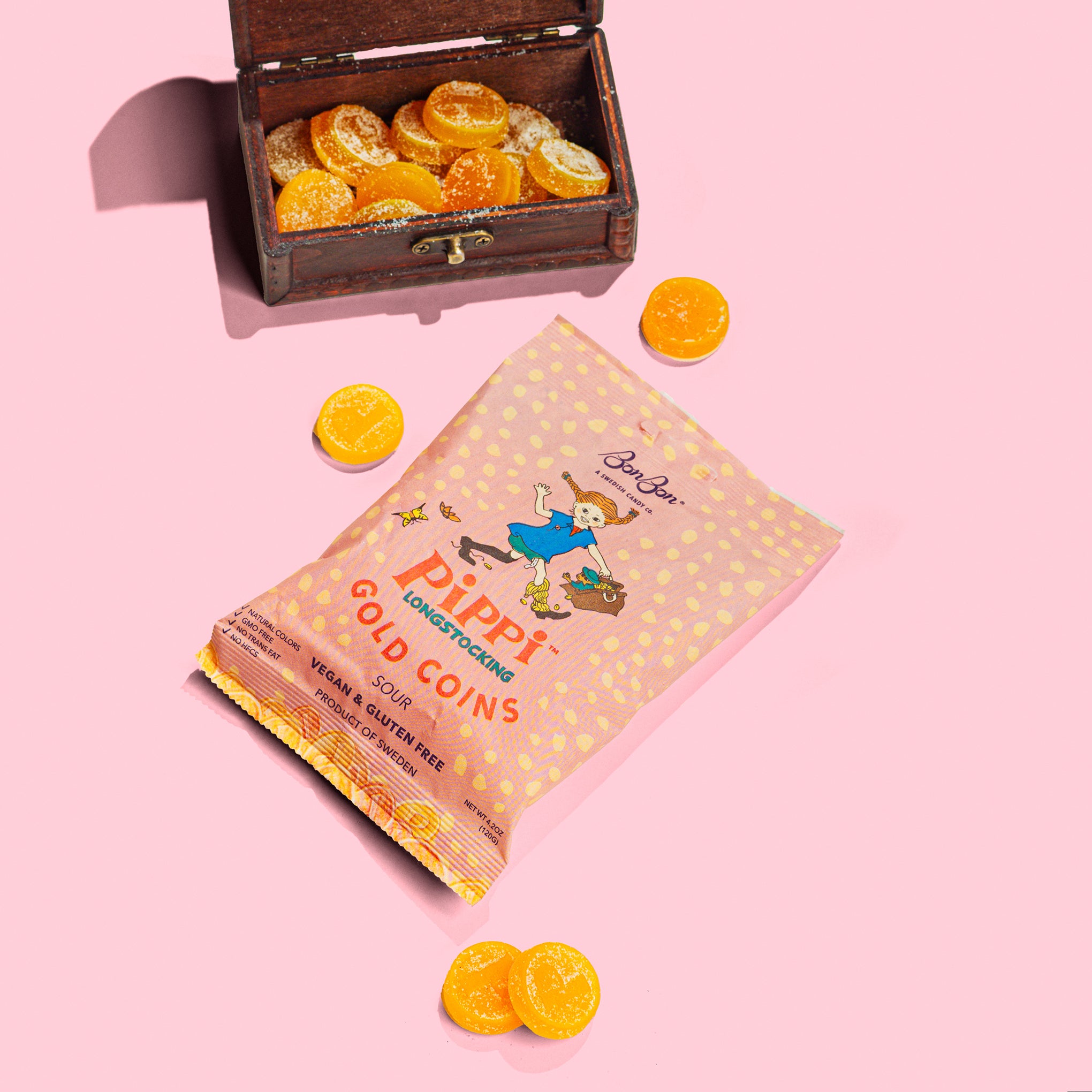 These gold-foiled wrapped candies are inspired by the Swedish storybook and film character Pippi Longstocking. These sweet and sour coins are as golden as the treasures Pippi finds on her travels. A wonderful stocking stuffer for kids and adults alike. Crafted in Sweden. these candies are pineapple flavored with a hint of apricot. Box measures 6.5h x 4.5w and contains 4.2oz of candy.