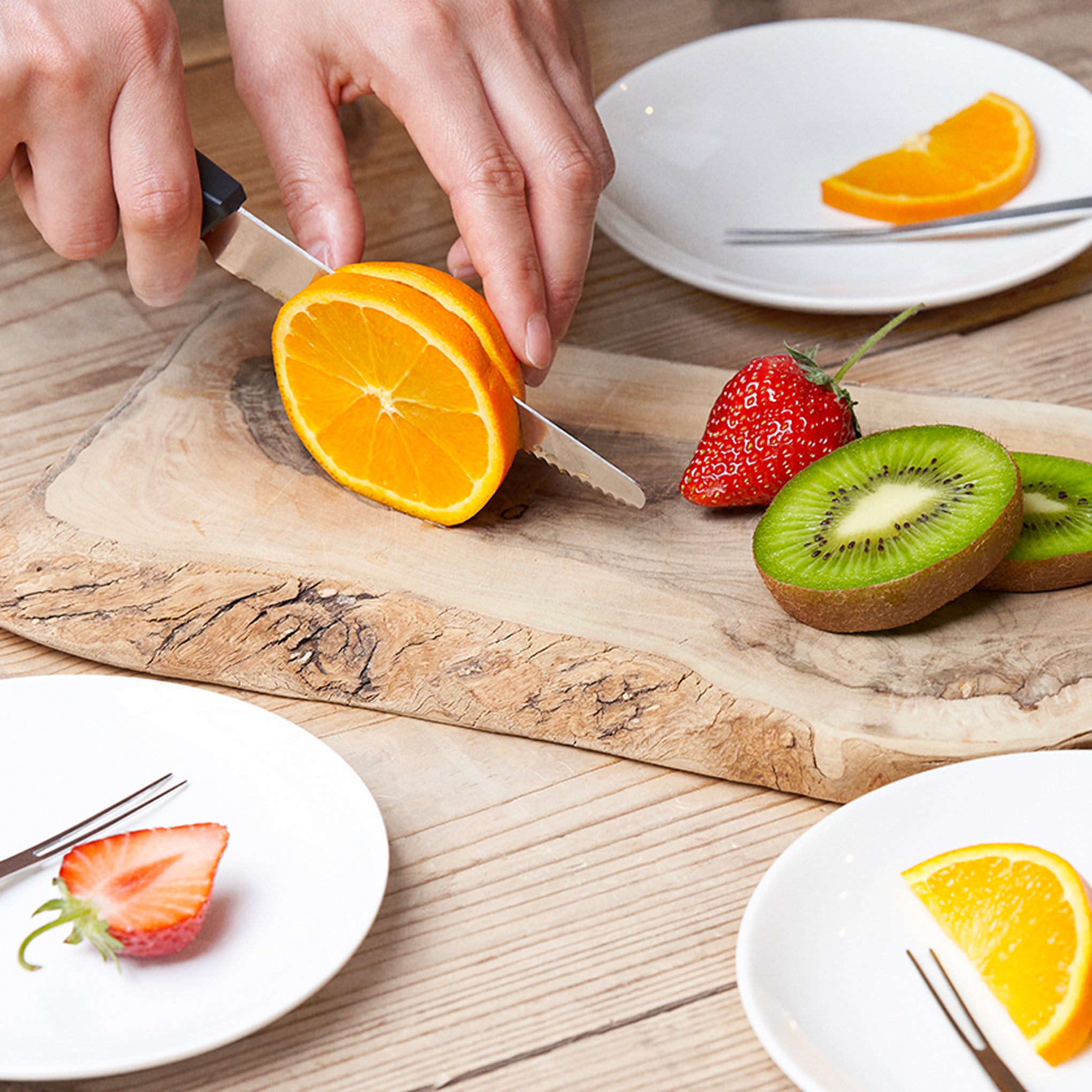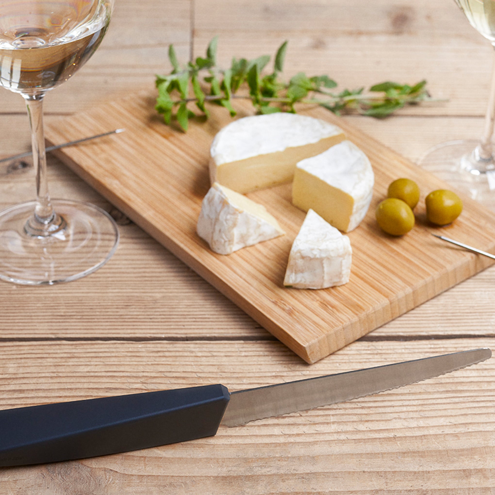 A kitchen knife that stands by. always ready for action. This clever cutter has a handle designed to keep it standing with the blade facing down. instead of on its side. making it more hygenic. Use it for cutting bread. cheese. vegetables. cakes and pies and more. The Raised Blade Table Knife is crafted in Japan with a stainless steel blade and ABS resin handle. It measures 1.2h x 1w x 9.25d. Dishwasher-safe.