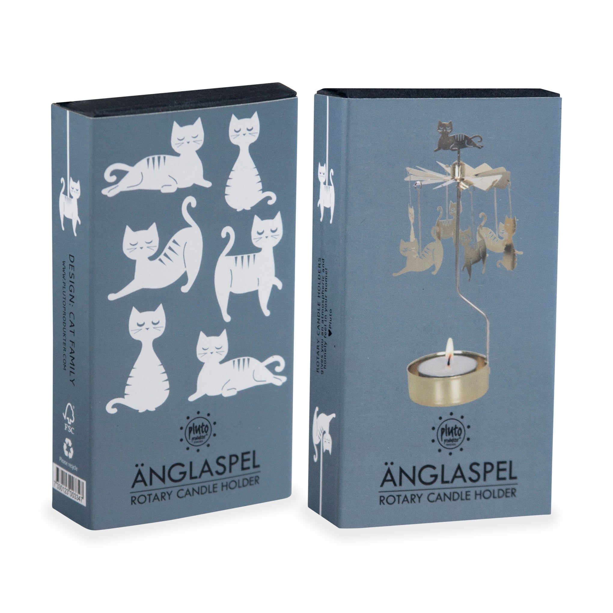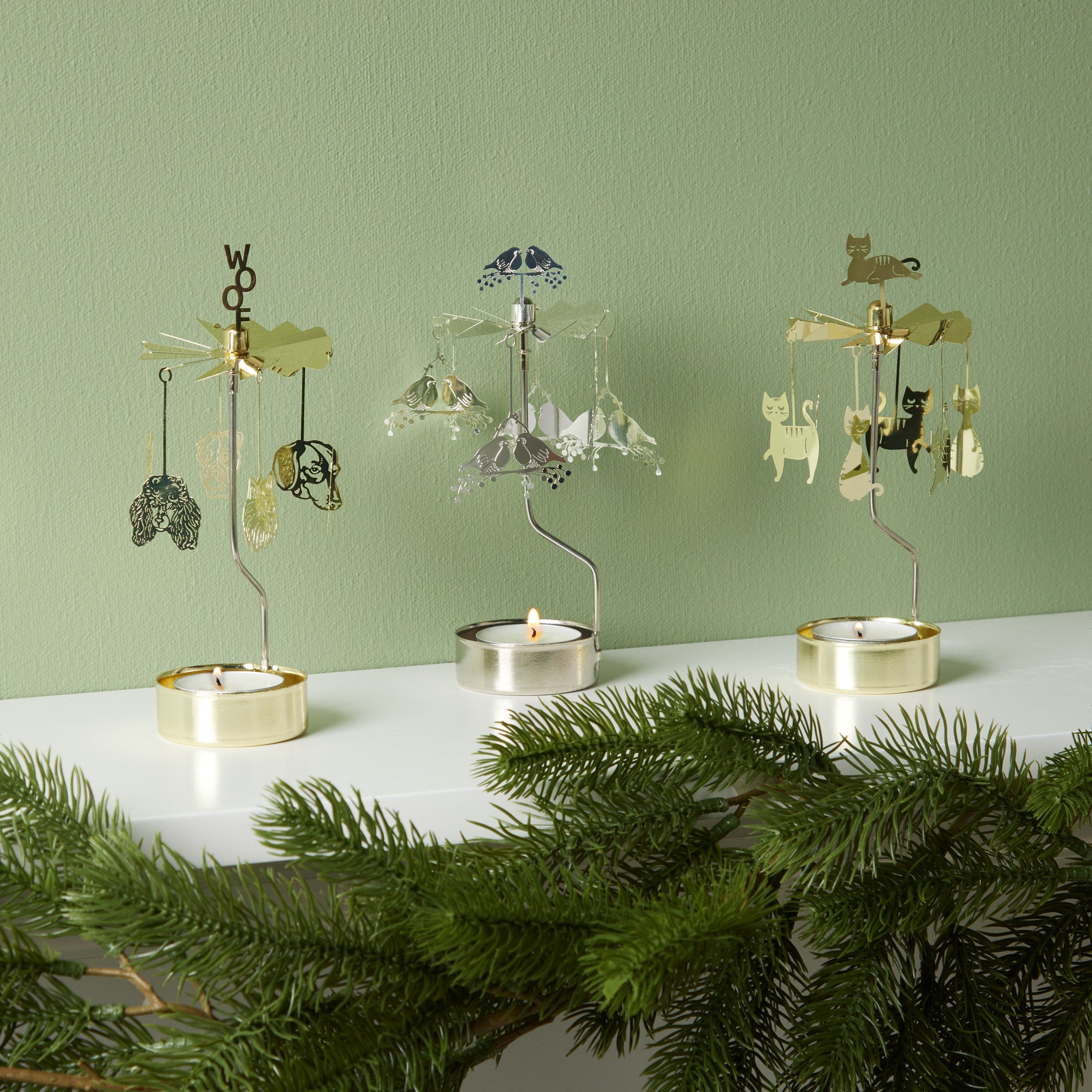 This enchanting Rotating Cat family Candle Holder features a tree inspired mobile that rotates when a lit votive candle is placed in the stand’s holder. Candles not included. The Rotary Cat Family Tea Light Candle Holder is made from plated iron and measures 5h.