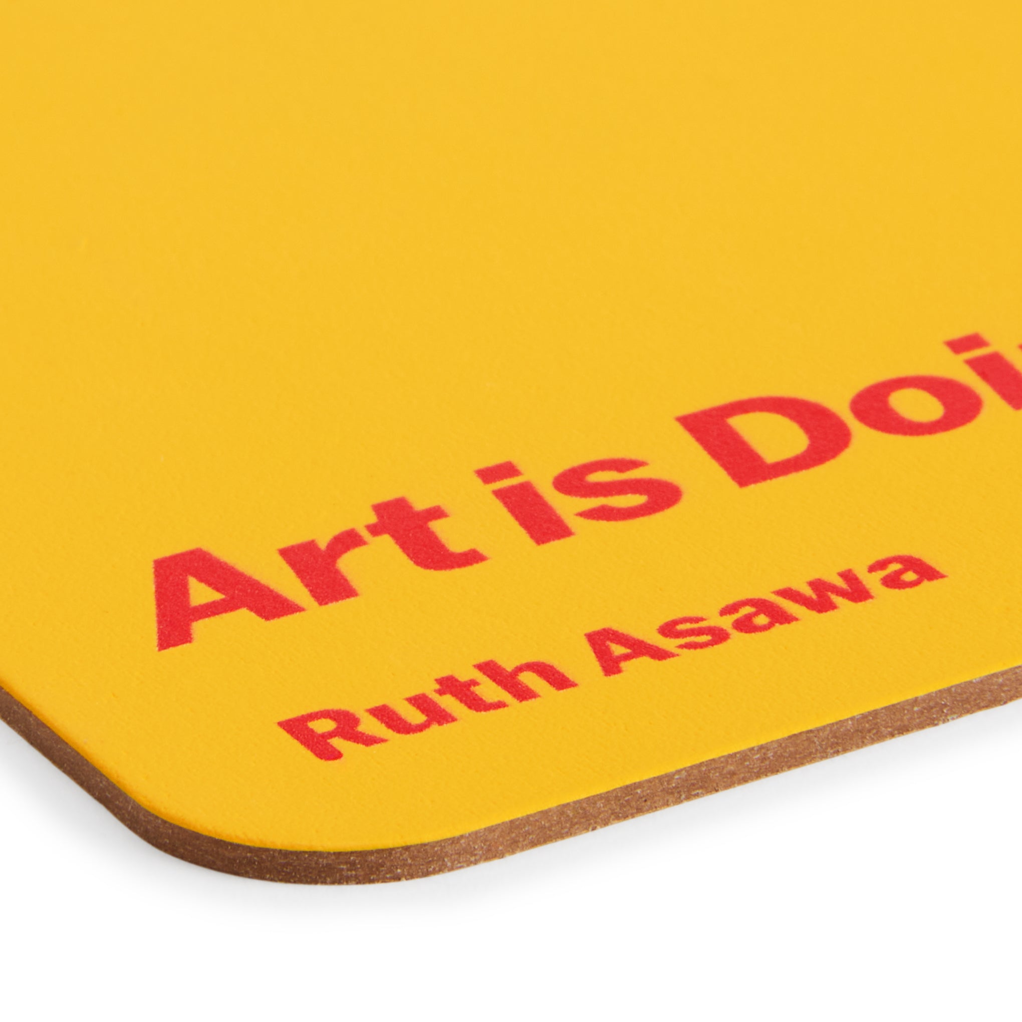 MoMA Exclusive: Real conversation starters for your next gathering. This set of four coasters is crafted from recycled leather and are printed with four different quotes from Ruth Asawa. an artist represented in MoMA’s collection. Each is in a different color: yellow. blue. brown and blue/green. Each measures 4sq. Ruth Asawa: A Retrospective will be on view at MoMA from October 19. 2025 through February 7. 2026.