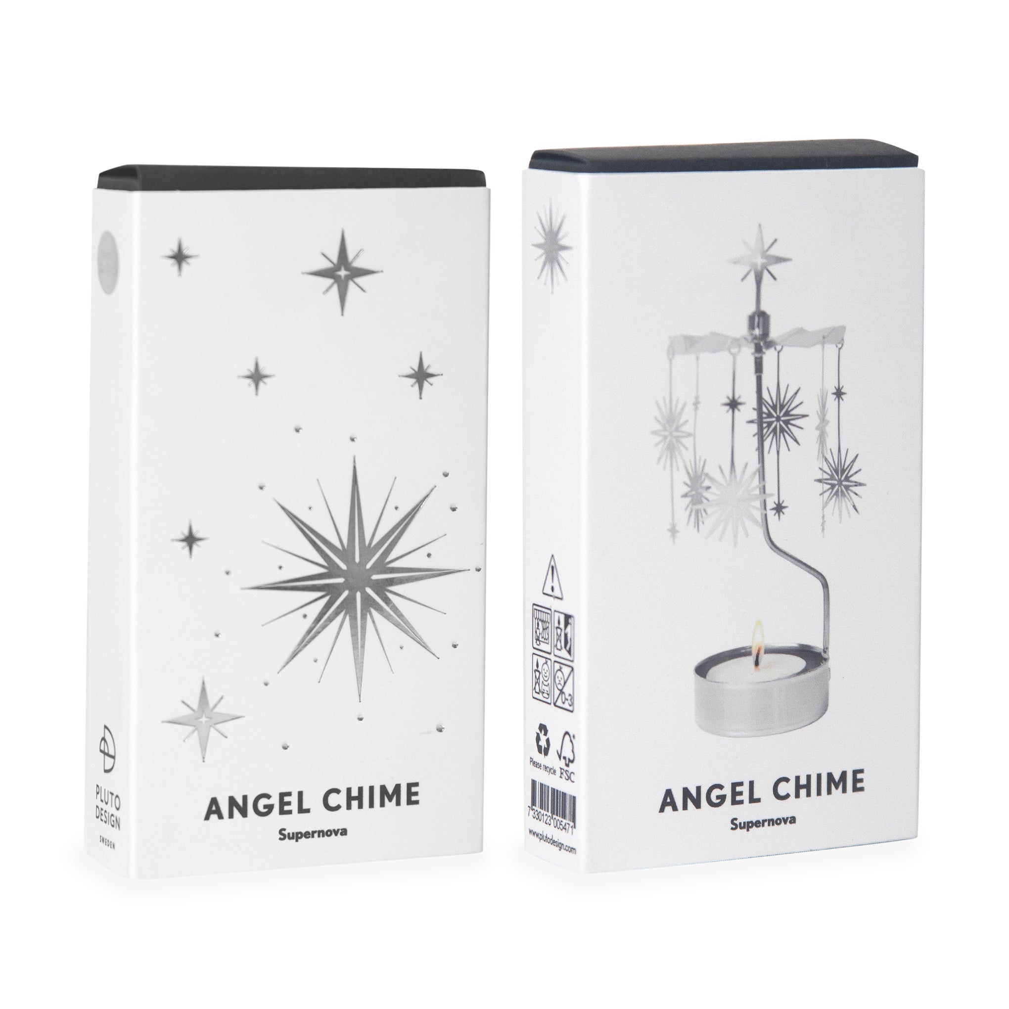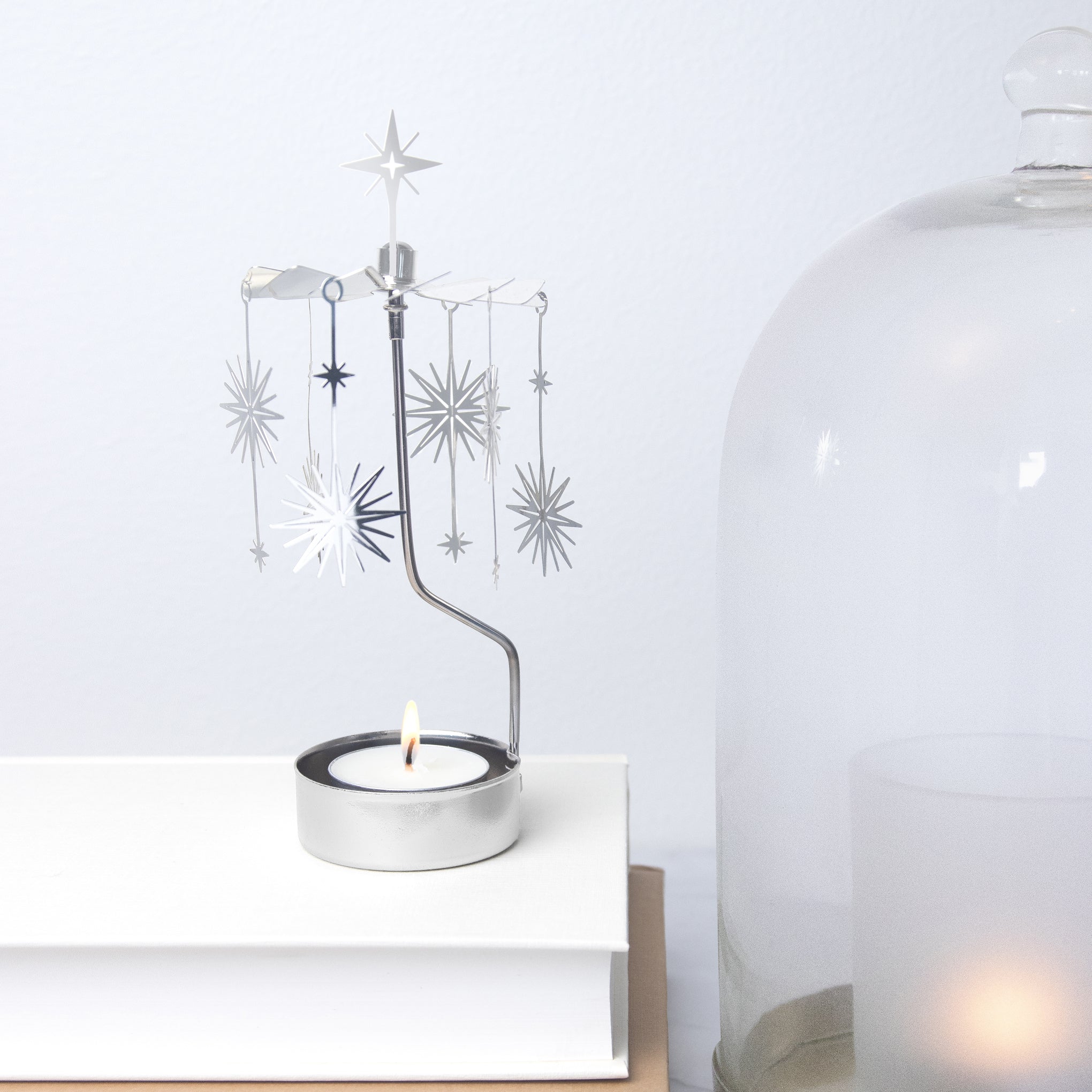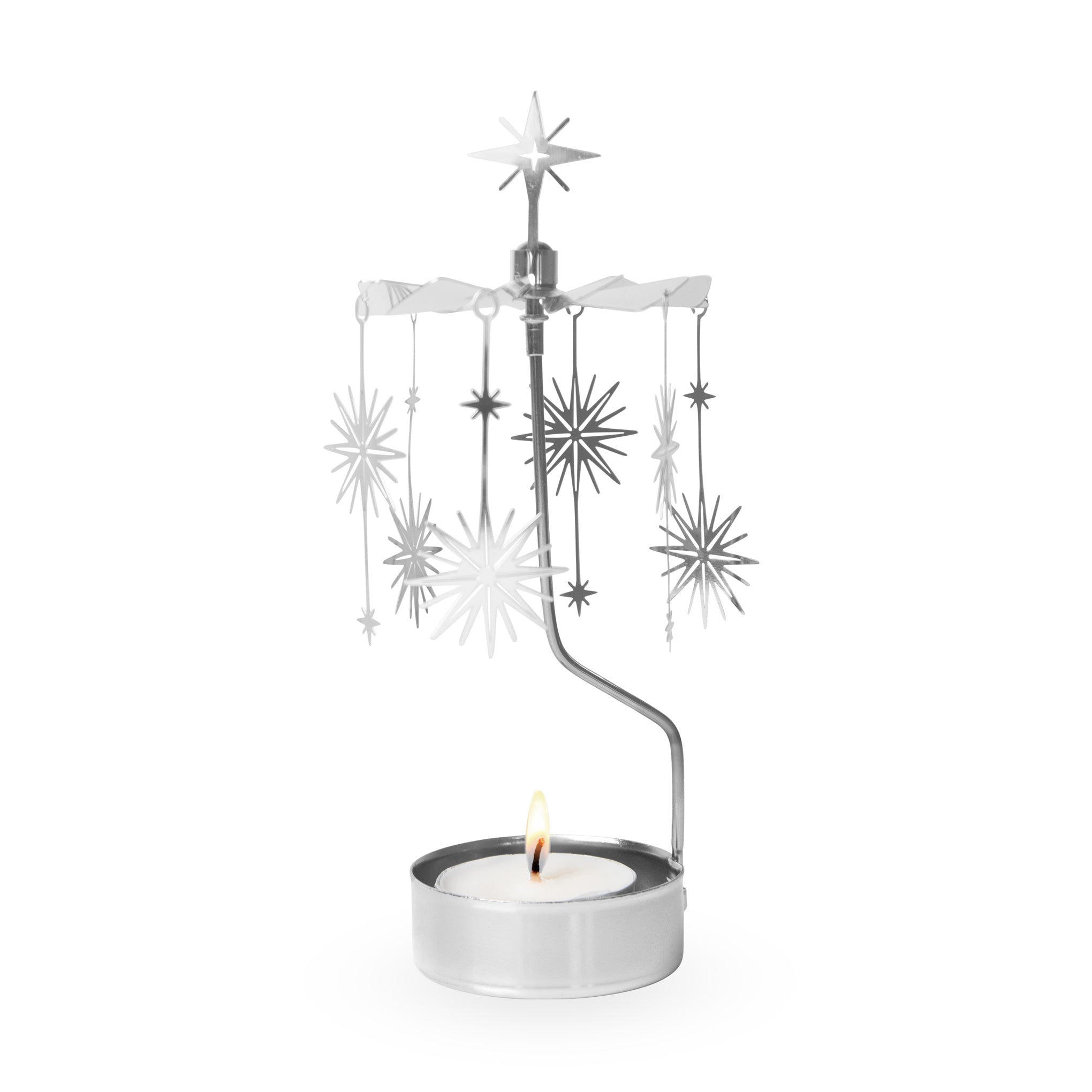 This magical Silver Supernova Rotary Tea Light Candle Holder features a tree-inspired mobile that rotates when a lit votive candle is placed in the stand’s holder. The tree is adorned with various bursting star motifs. Candles not included. The Silver Supernova Rotary Tea Light Candle Holder is made in Sweden from plated iron and measures 6h.