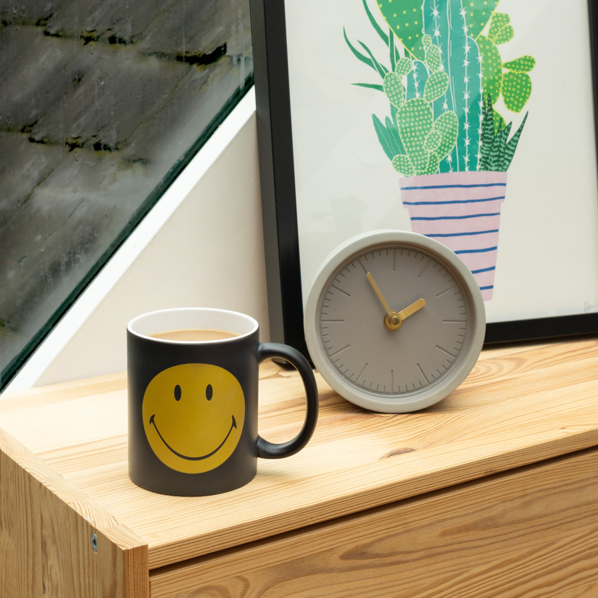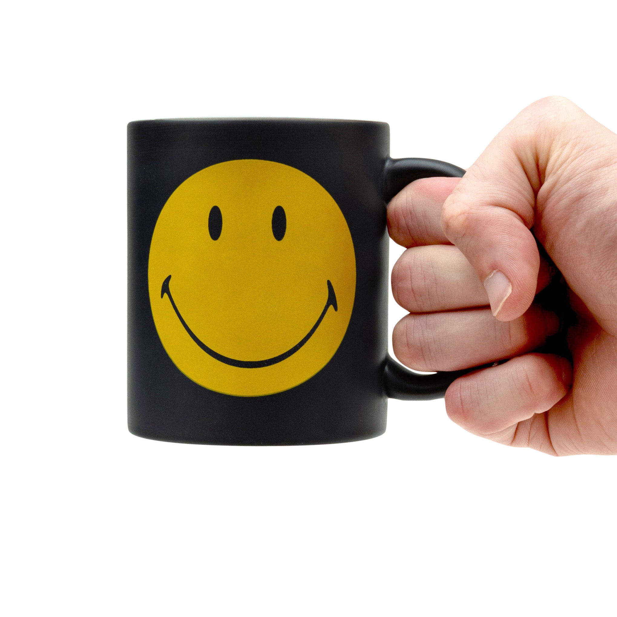 A literal visualization of how that morning cup of coffee makes you feel. This black ceramic mug slowly reveals a happy yellow smiley face motif on both sides of the mug after a hot beverage is poured into it. First published as a symbol for happy news in the French newspaper France-Soir in 1971. Franklin Loufrani designed the smiley face for his column and invited viewers to Take the Time to Smile! Since then. Smiley has become a happy icon that communicates positivity to the world. An emblem for anyone preferring to swap a narrative of despair with possibility and promise. the Smiley collection radiates a simple. universal joy. The Smiley Face Ceramic Mug measures 4.7h x 3.3w x 3.8d and holds 12oz. Not microwave-safe. Hand wash only.