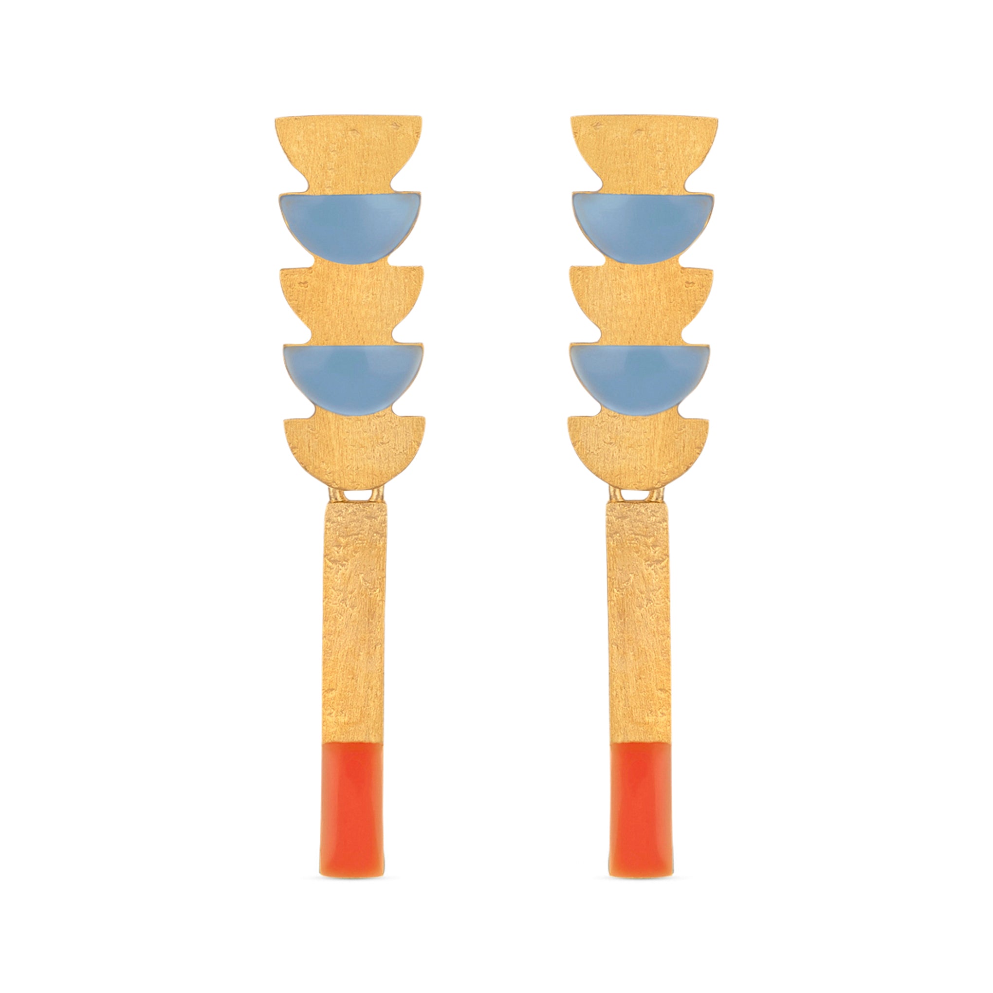 Entrepreneur Jaume Julià founded Joidart in 1981 after visiting a picturesque mountain village near Spain’s Costa Brava and converting an old metalsmith’s workshop into his contemporary jewelry company. For a collaborative collection called Somni (dream in Latin). the brand interprets the illustrations of artist Judit Canela to capture the essence of Mediterranean light and the vibrancy of the Catalan Coast. These Gold-Plated Red & Blue Long Earrings are formed by geometric shapes in 24k gold-plated matte metal and colored enamel. Wear them to add an eye-catching element to everyday looks. The Somni Gold-Plated Red & Blue Long Earrings have a butterfly nut closure and measure 1.70l x 0.32w.