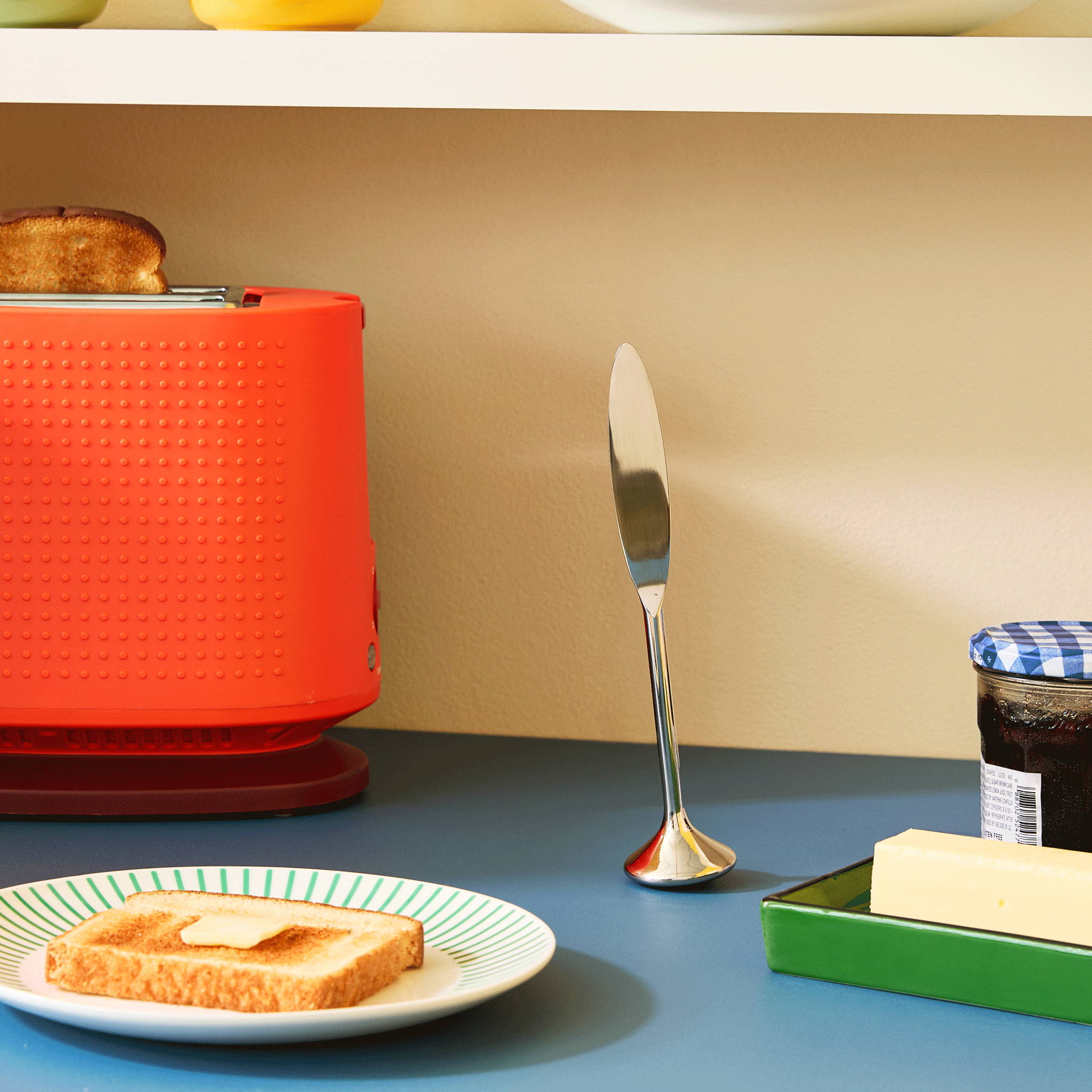 From Italian heritage brand IPAC. founded in 1950. comes this innovative. elegant kitchen tool. Crafted from stainless steel. the Standing Spreader Knife features a weighted bottom that keeps it standing upright on your table or counter and within easy reach. After you use it to spread butter. jam. peanut butter or honey onto your bread or toast. place it down to return to its automatic standing position. This keeps your table clean from food residue and eliminates the need for an extra plate. The weighted bottom allows the knife to wobble back and forth slightly. so it can’t be knocked over. The Standing Spreader Knife measures 8.5h x 2diam. Dishwasher-safe.