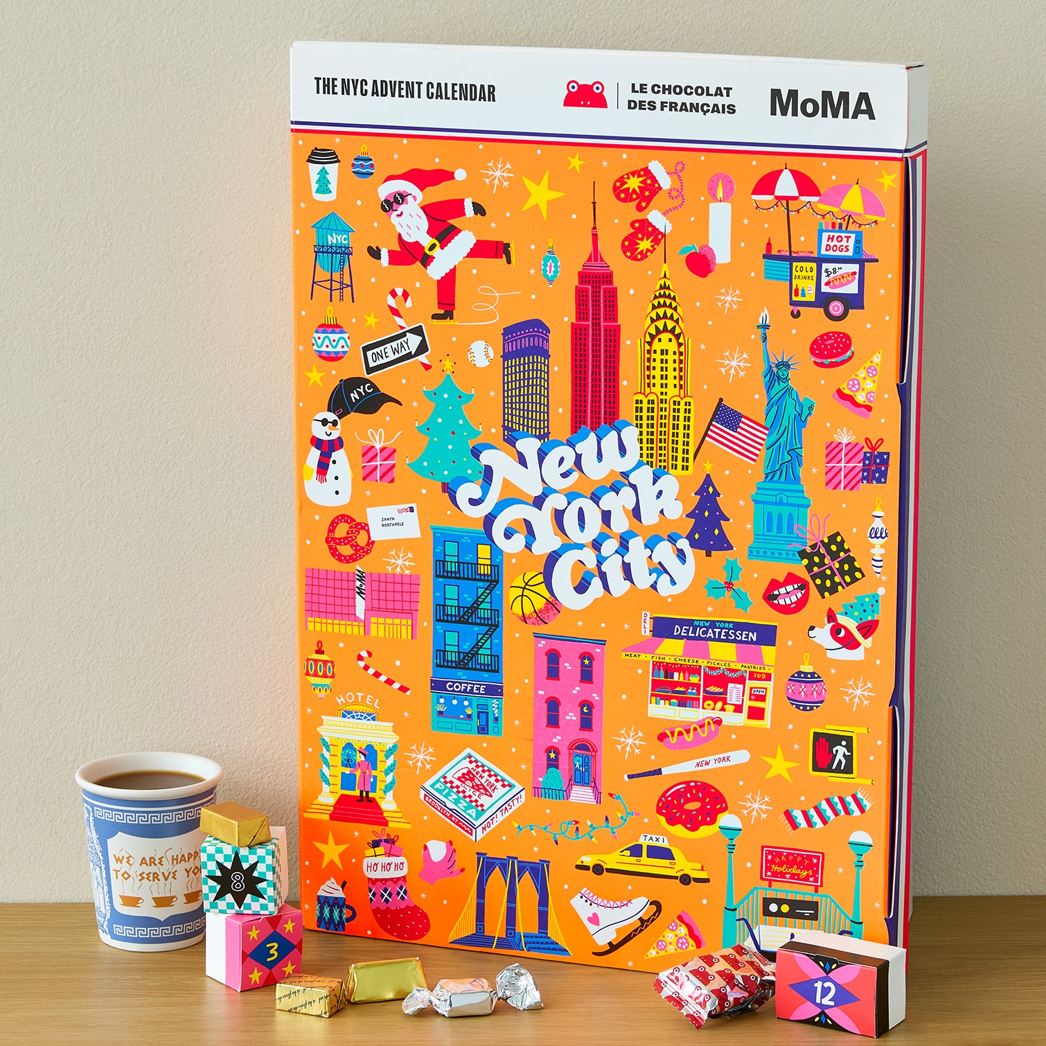 MoMA Exclusive: With this Chocolate Advent Calendar. embark on a 24-day journey through the streets of New York. all decked out for the holidays. From the Empire State Building to the Statue of Liberty. take a taxi or sled ride along with ice-skating animals on the quest for 24 pieces of gourmet French chocolate. one for each day counting up to Christmas. Made in the South of France with 100% cocoa butter and no palm oil. this Chocolate Advent Calendar conceals 14 different flavors of chocolate. from praline to caramelized hazelnuts. The festive calendar measures 20h x 14w x 1d and is illustrated by Ruby Taylor. The calendar measures 20h x 14w x 1d.