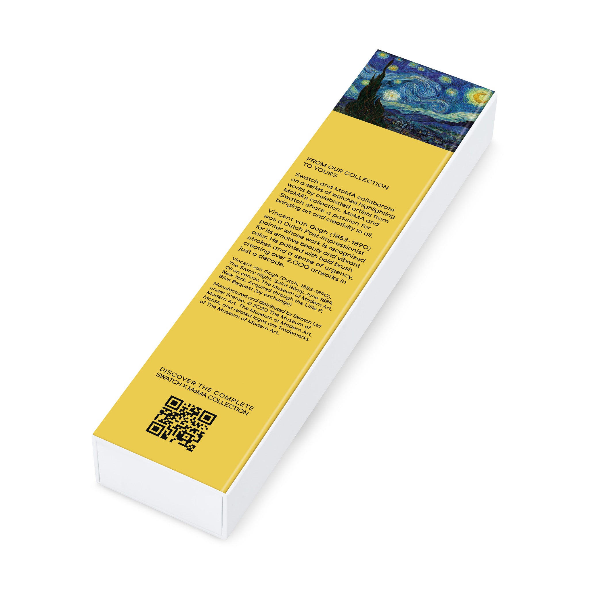 We’ve teamed up with Swatch—their name is a contraction for second watch—to create this special collection of watches that feature details from artworks from MoMA’s collection. Each MoMA and Swatch Watch is made from nylon with a waterproof PU coating and is water-resistant up to 100 feet. Swatch has watch designs in the Museum’s collection.