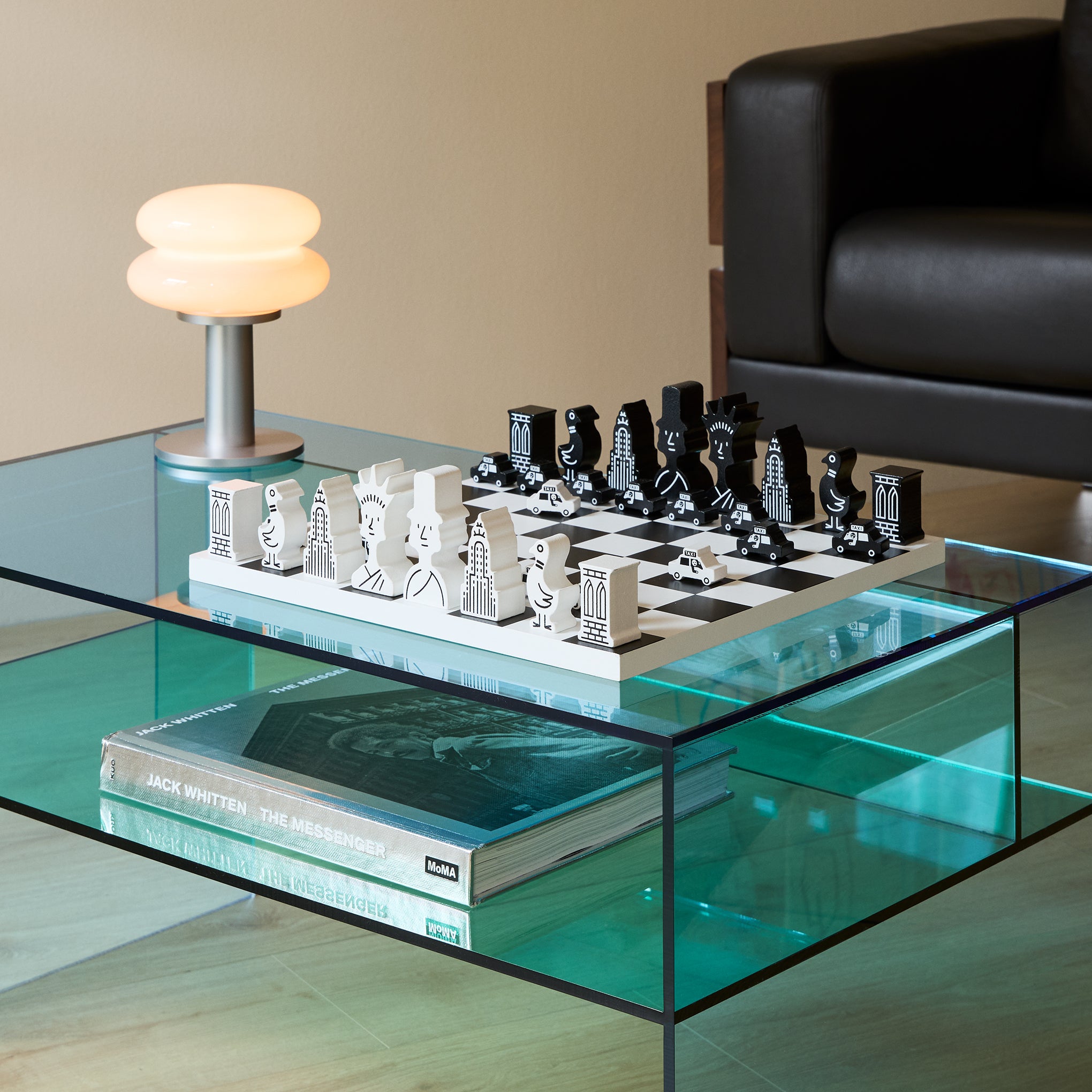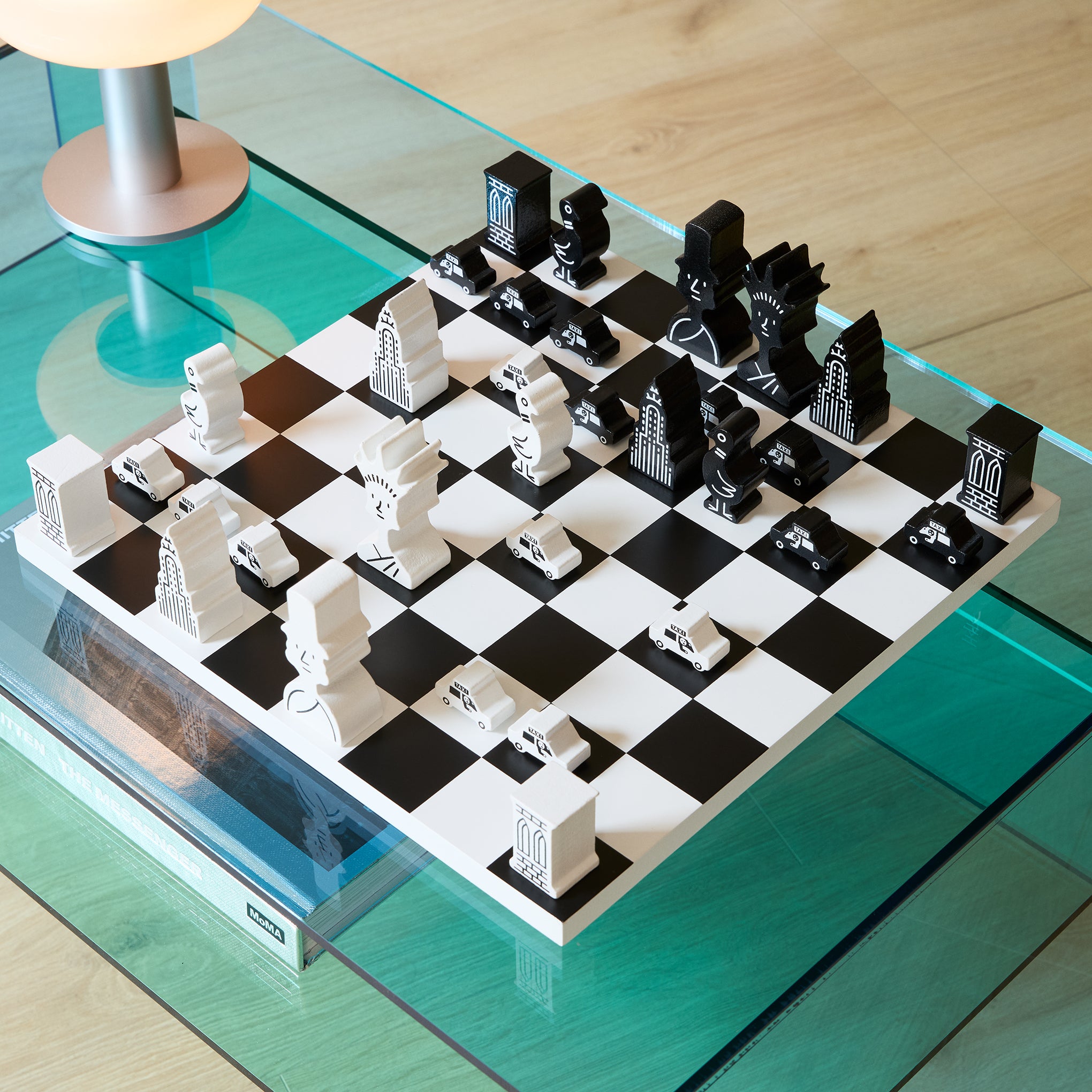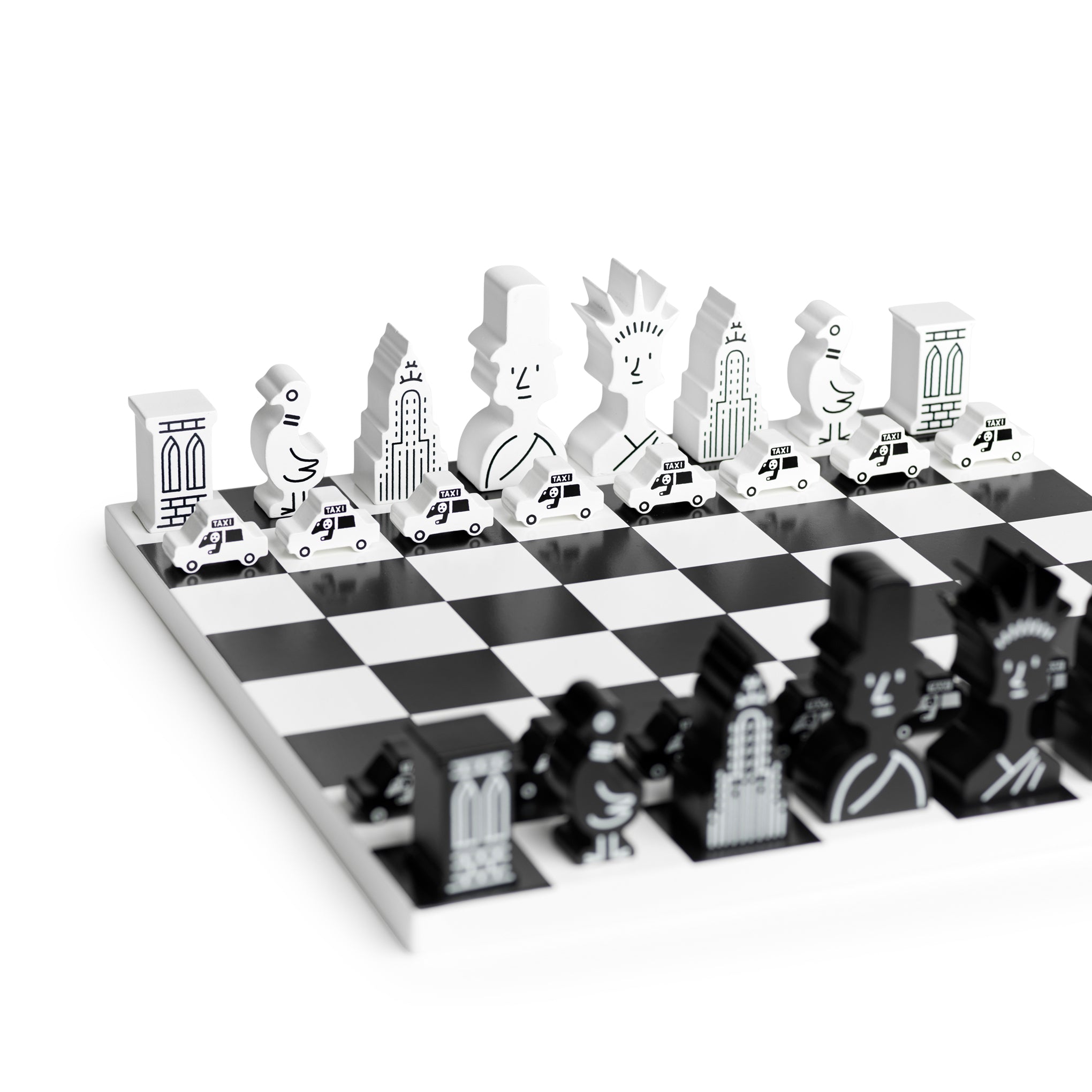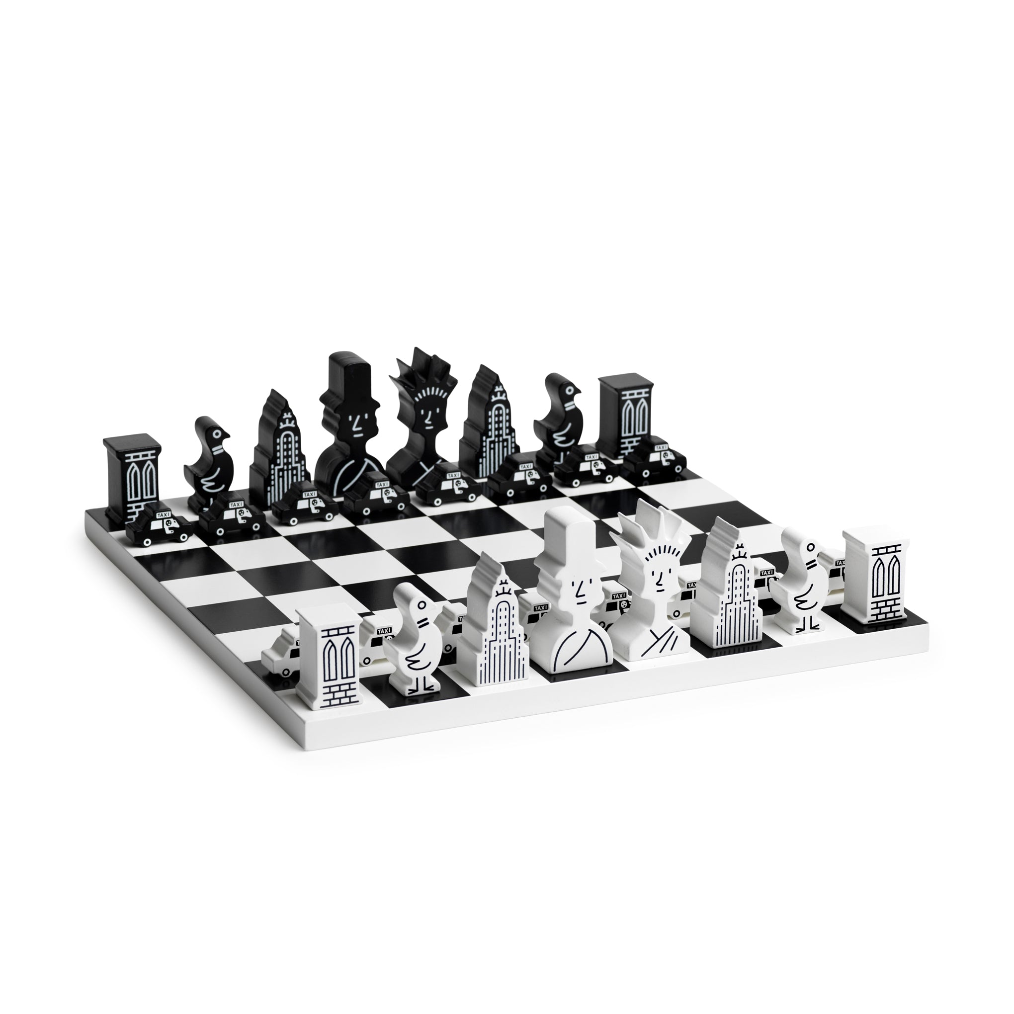 The Brooklyn Bridge. the Chrysler Building and. of course. a pigeon: This black and white chess set celebrates the 100th anniversary of The New Yorker magazine with pieces fashioned as 3D illustrations of NYC landmarks. The New Yorker Magazine Chess Set is illustrated by Christoph Niemann. a frequent contributor to The New Yorker and an artist with work in MoMA’s collection. Pieces include taxi cabs as pawns. pigeons as knights. the Brooklyn Bridge as rooks. the Statue of Liberty as the queen and more. The New Yorker Magazine Chess Set is made from wood and paperboard. The board measures 2.2h x 13.8w x 13.8d; the tallest piece. the King. is 3h.