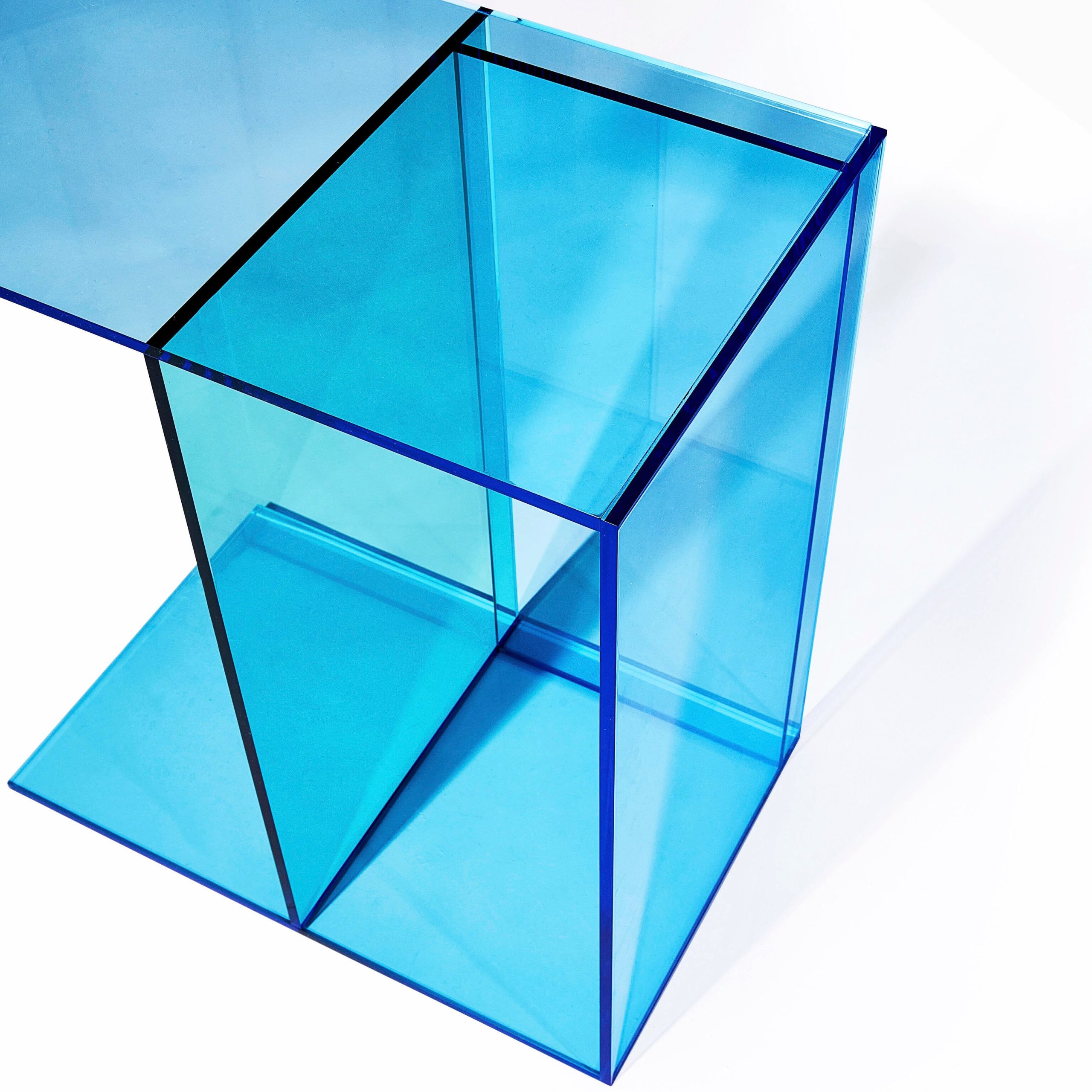 MoMA Exclusive: Cleverly designed for versatility. the Two-Way Side Table is a strikingly simple. shape-shifting piece. Crafted from planes of transparent acrylic. this small table playfully interacts with its surroundings. creating new colors and reflections specific to the space it lives in. The 16h x 18w x 10 design can be used horizontally as an eye-catching side table. or vertically as a stand that intersects a sofa to keep drinks and remotes handy. Designed in Montreal. the Two-Way Side Table is as versatile as it is sculptural. Weight capacity: 22 lbs.