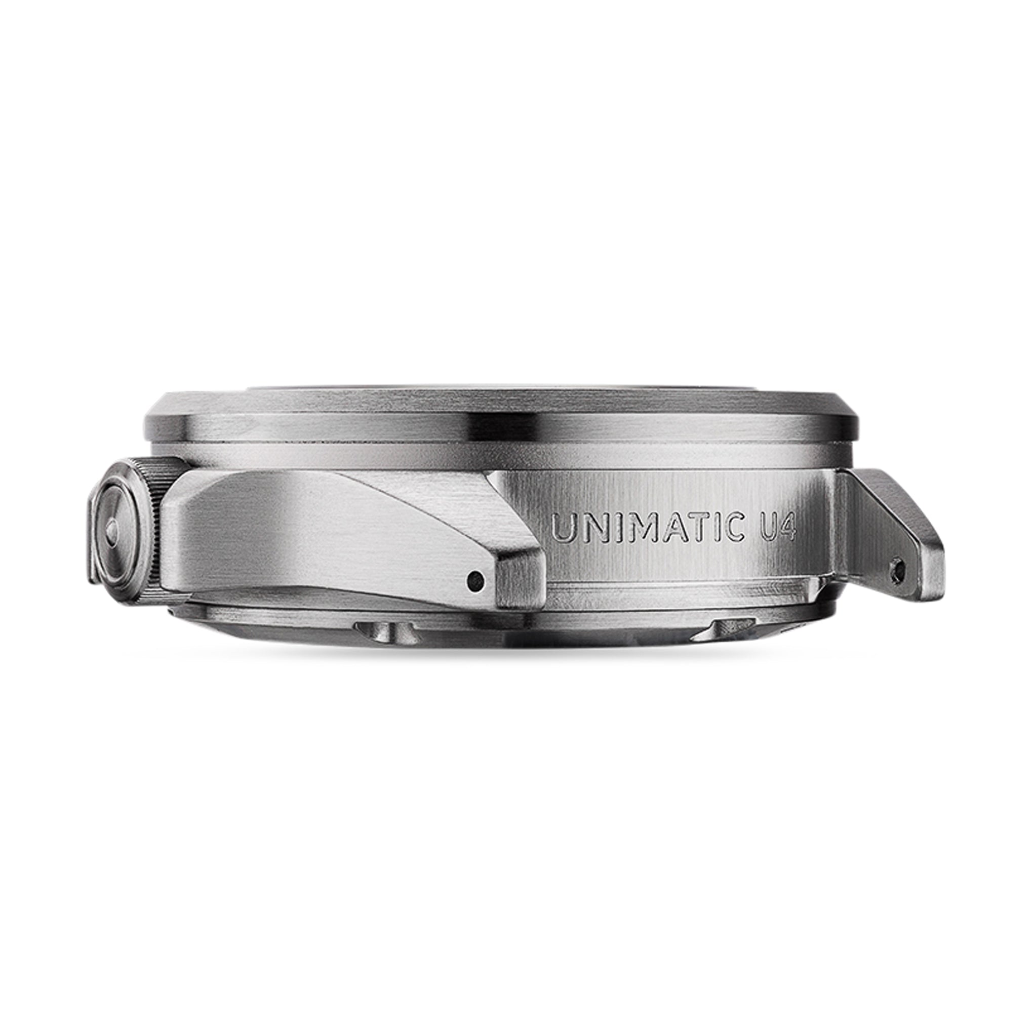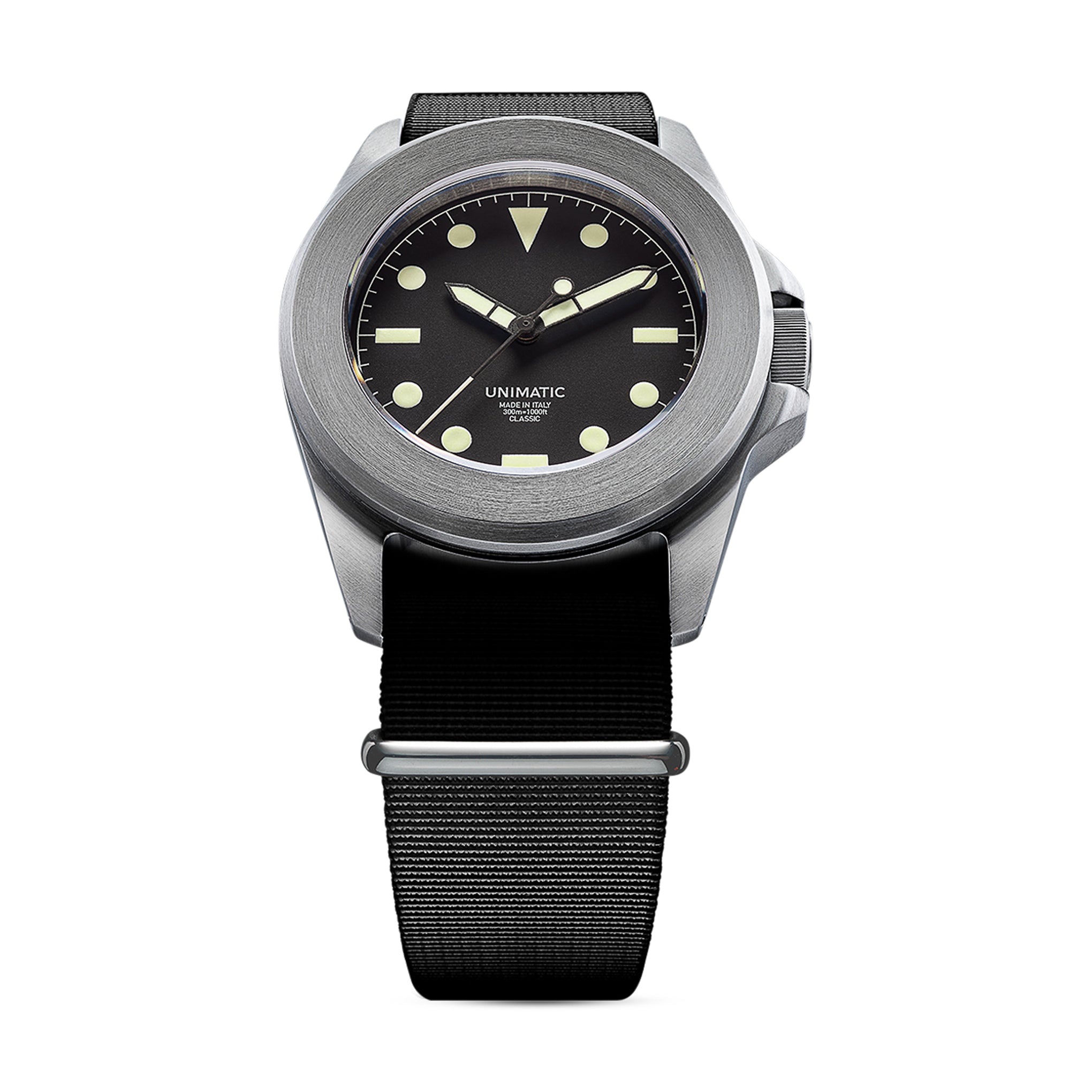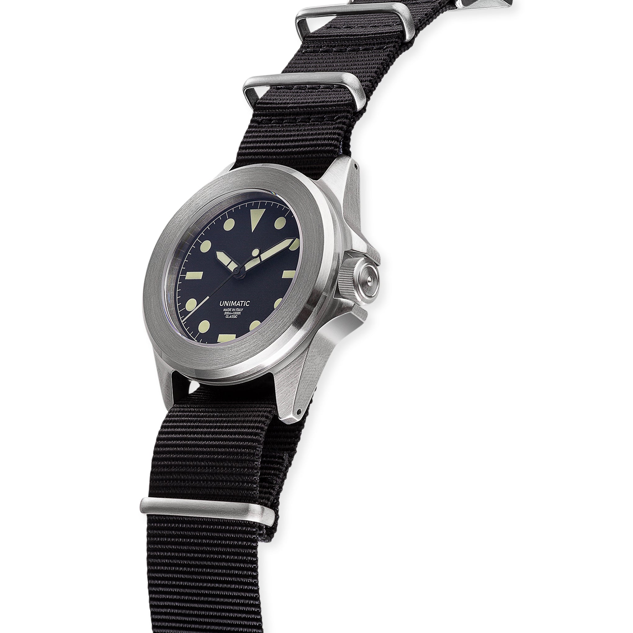 Founded by a pair of industrial designers in 2015. Unimatic produces diver. chronograph and field watches in Italy. This Modello Quattro Diving Watch has a military-inspired design that blends the Modello Uno Watch case into a bolder. tougher aesthetic. thanks to its Unimatic fixed bezel.