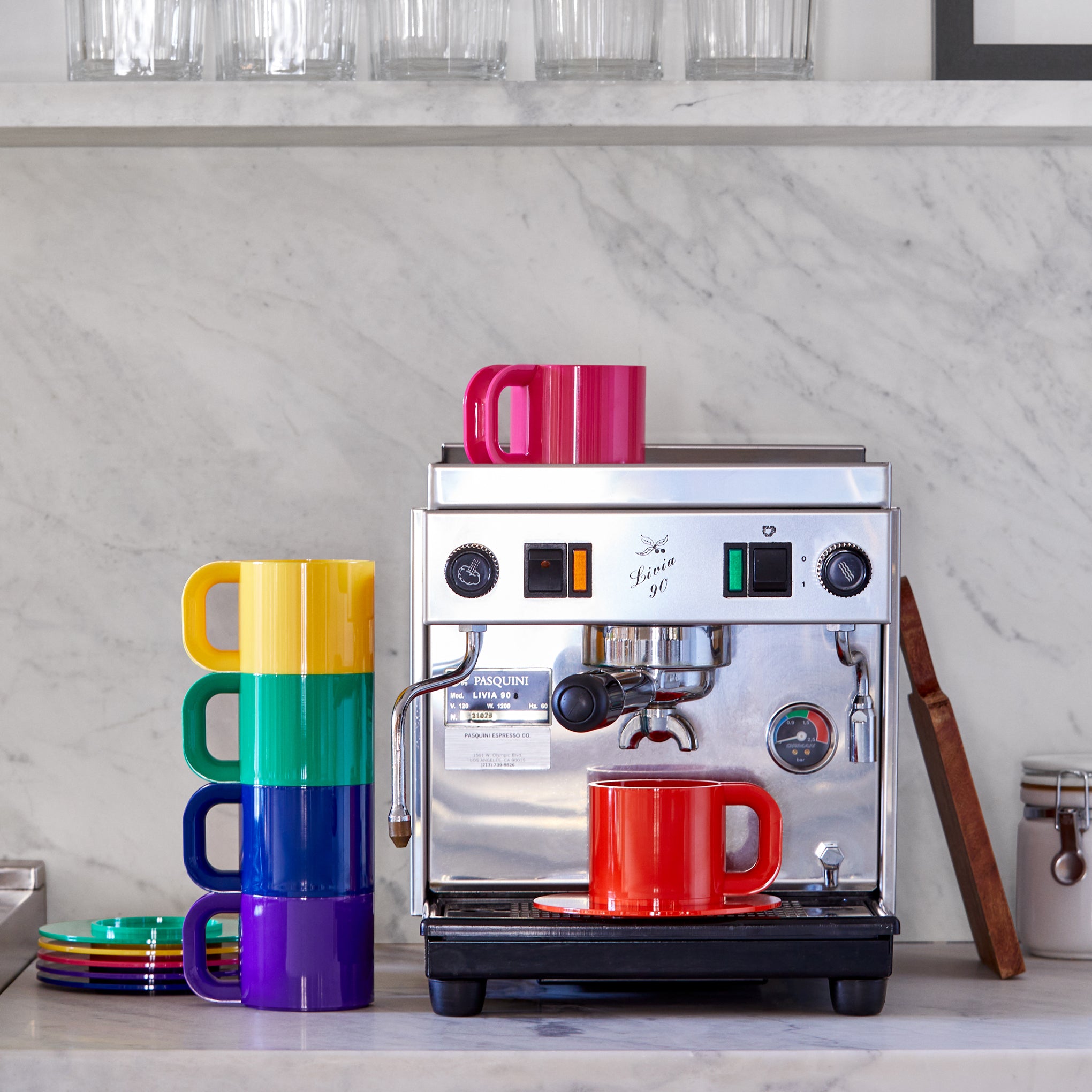Designed by Lella and Massimo Vignelli in 1964. this Max Cups & Saucers is from their revolutionary Hellerware stacking tabletop concept. Made from durable polystyrene plastic. this set of six cups and six saucers is made for everyday use. They stack up for compact storage in your cupboard. or leave them out on your counter for an interesting visual and colorful statement. Each cup measures 2.5h x 3.5diam and each saucer measures 0.25h x 5.75diam.