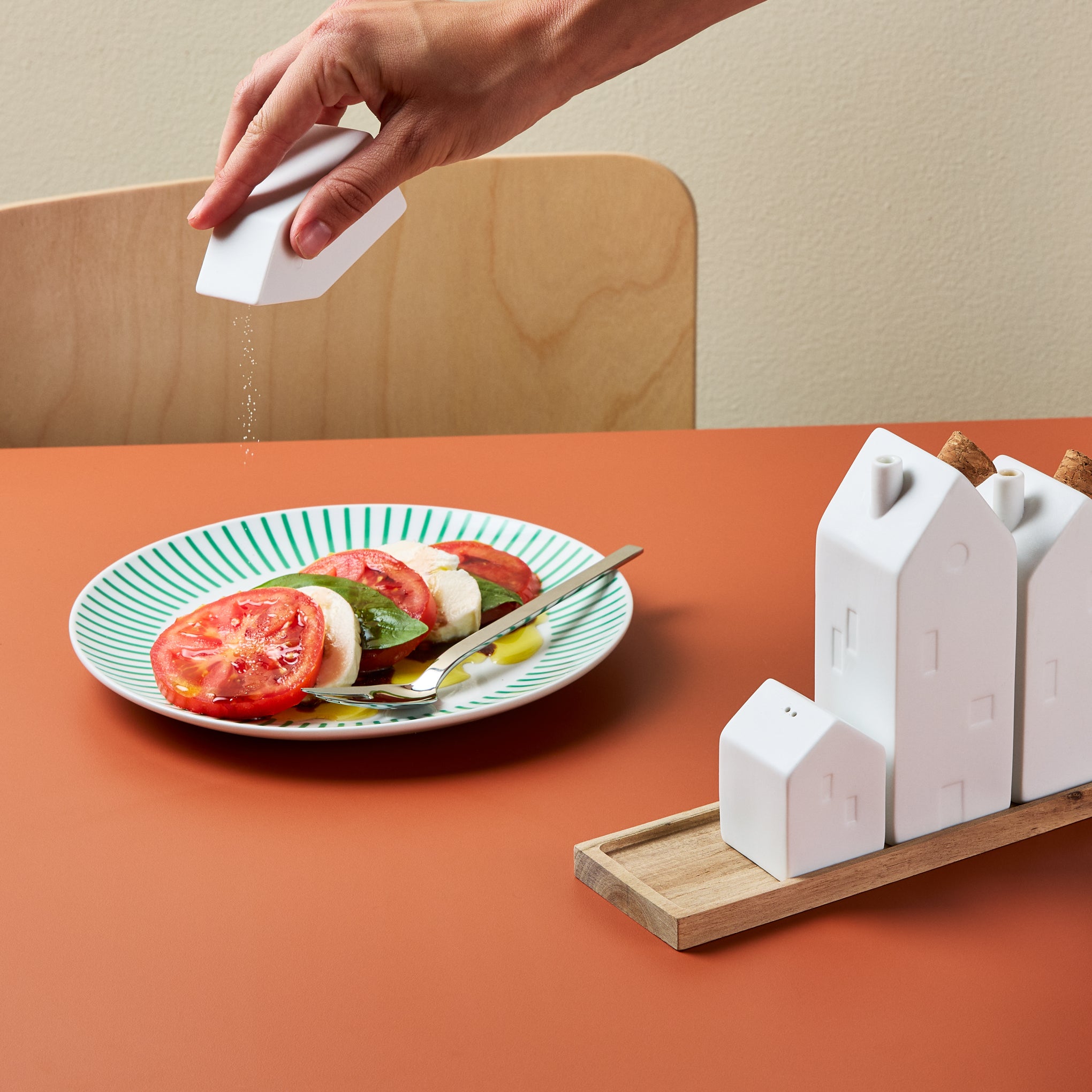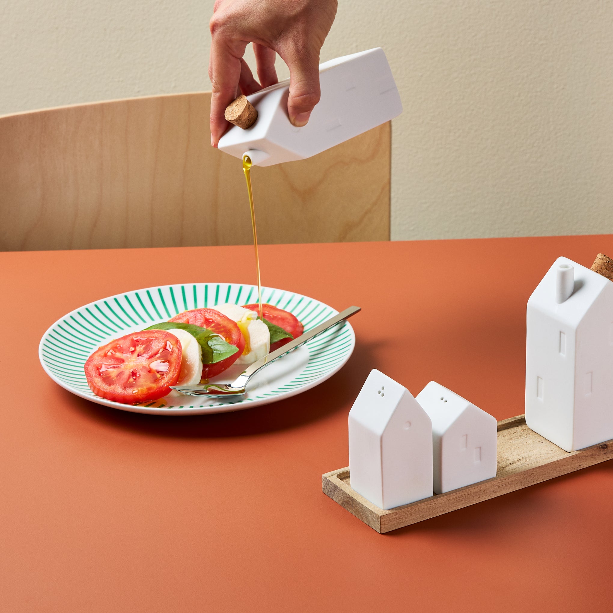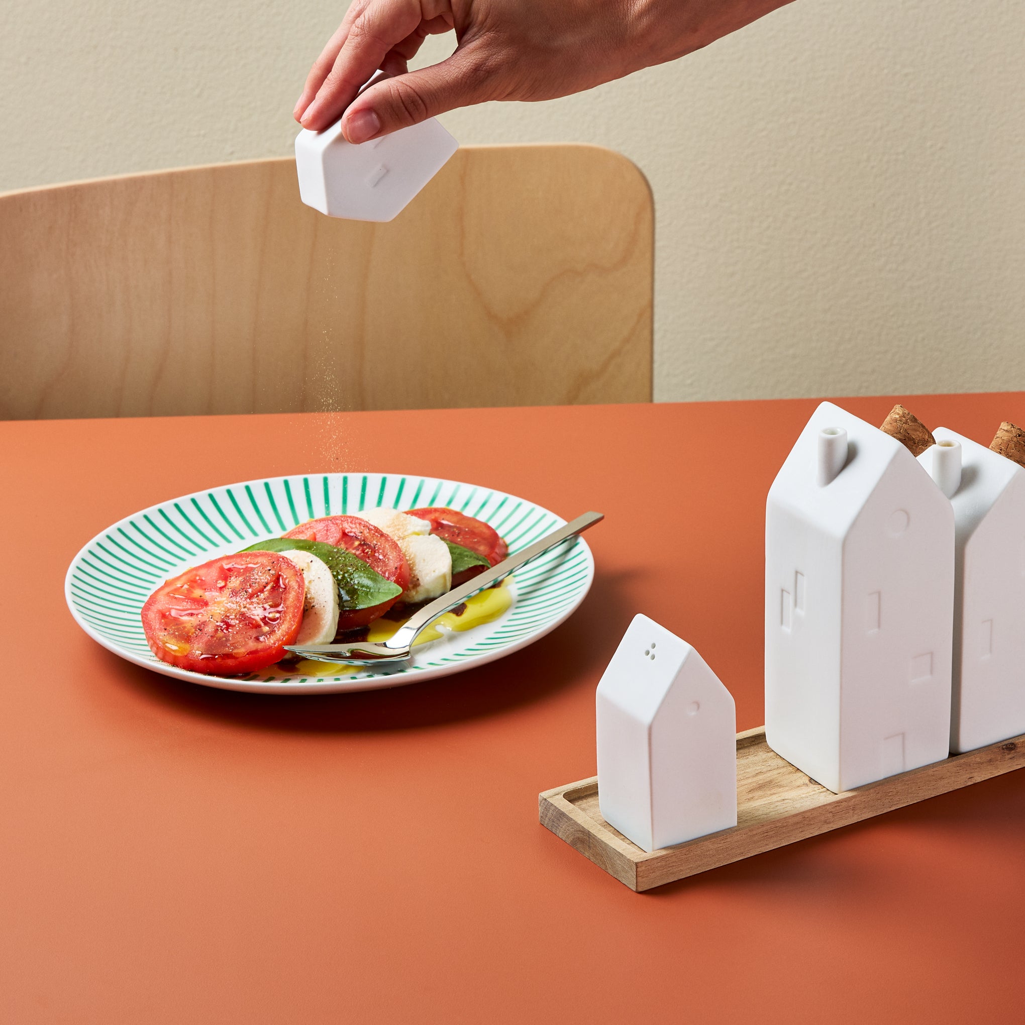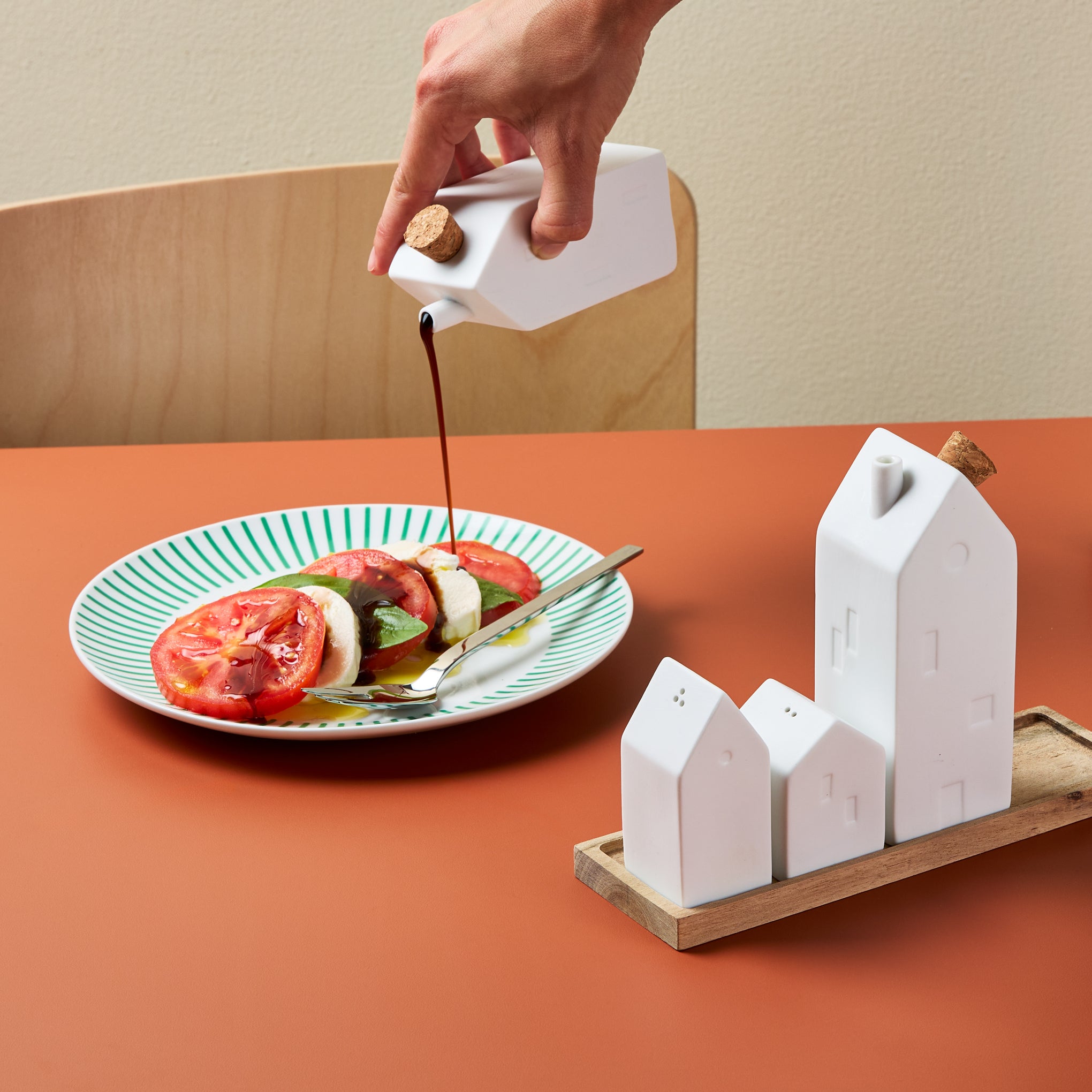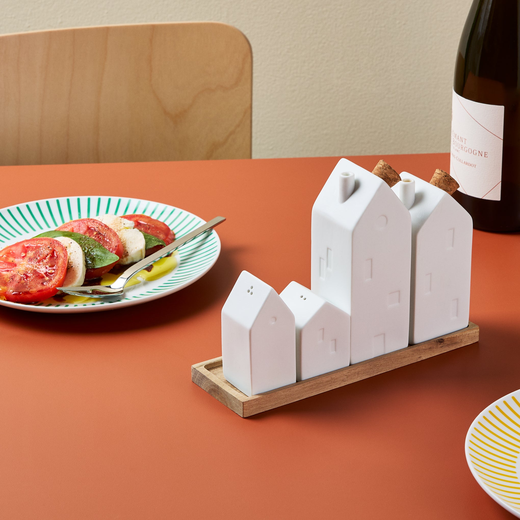 Modern. organized. whimsical: This set of four white porcelain seasoning vessels are crafted in the shape of minimalist houses. in descending order of height. Their surfaces are embossed with accents that represent windows. for a decorative touch. Use the two large vessels for olive oil and vinegar. and the two smaller ones for salt and pepper. The large houses feature spouts for drizzling and corked openings for refilling. The shakers can be filled from the bottom. All four houses fit neatly into the included acacia wood tray.