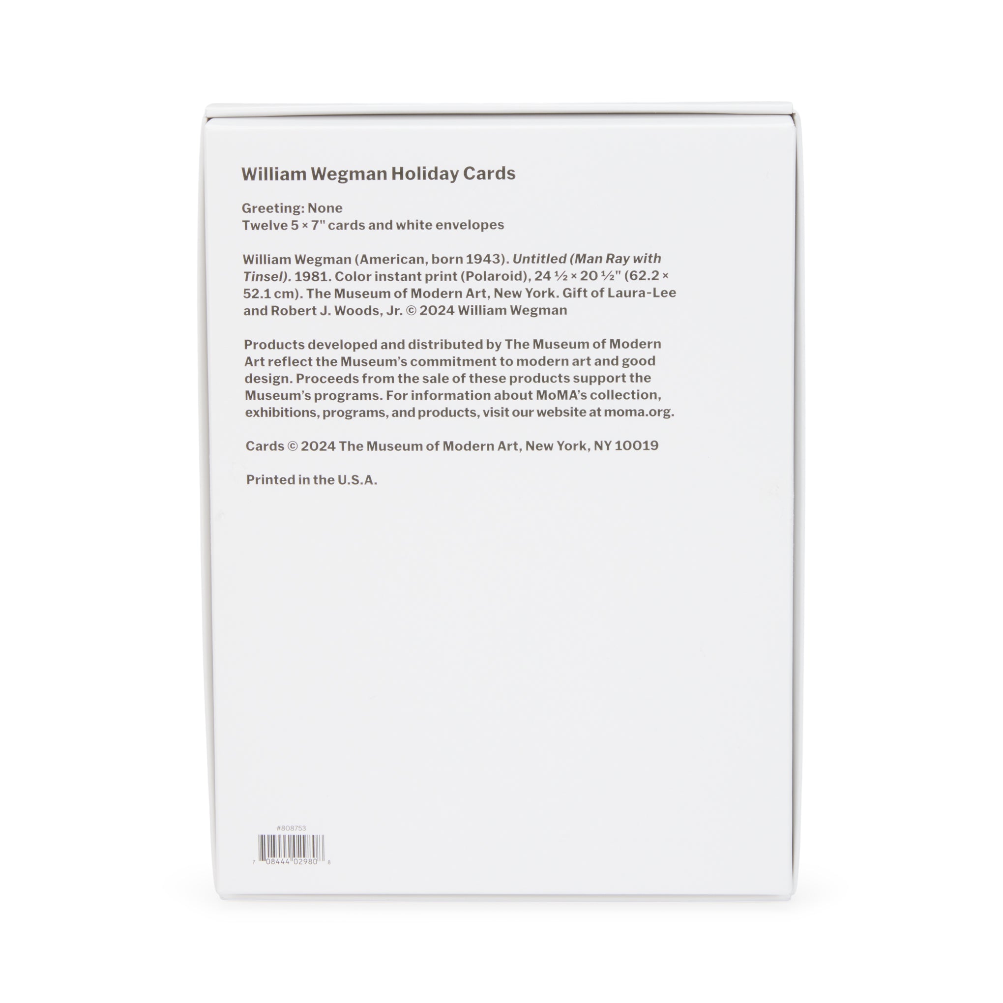 This set of 12 holiday cards features a reproduction of William Wegman’s Untitled (Man Ray with Tinsel) (1981). a Polaroid photo artwork in MoMA’s collection. Wegman began working with his dog. Man Ray—named after the famous Surrealist artist—in the 1970s. positioning the dog in various humorous props and costumes. Each card measures 7h x 5w. White envelopes.